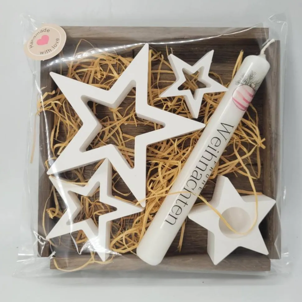 Das Dekorationsset Sterne mit Kerze ist ein wundervolles Geschenk zu Weihnachten. Enthalten sind drei dekorative Sterne aus Raysin (Gips), ein passender Kerzenständer und eine Kerze mit einem weihnachtlichen Spruch. Diese Artikel werden liebevoll von Hand gegossen und eignen sich perfekt als Überraschung für die Liebsten. Zusätzlich werden die Artikel in einer kleinen dekorativen Tablett verpackt.Die Kiste wird aus kleinen Holzklötzchen ebenfalls von Hand hergestellt.Sie eignet sich sowohl als Verschenkkiste und zum dekorativen präsentieren zuhause.
