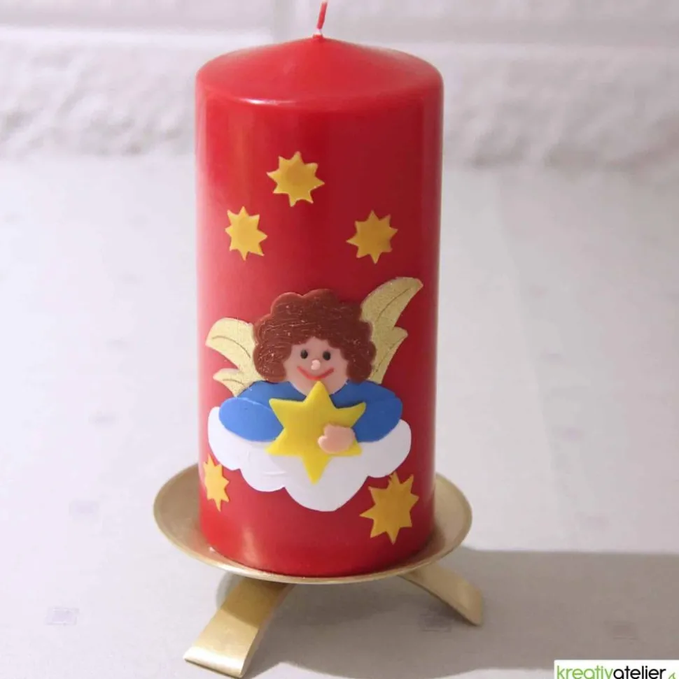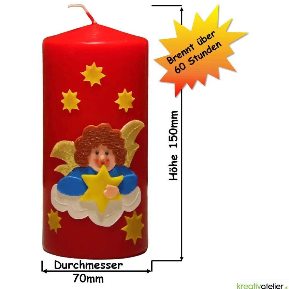 Der Engel, der zentral auf der Kerze thront, ist ein Kunstwerk für sich. Seine Gestalt ist durch mehrere Wachslagen detailreich herausgearbeitet, wobei insbesondere das fein konturierte Gesicht und die in sanften Locken fallenden braunen Haare hervorstechen. In seinen Händen hält der Engel einen großen Stern, ebenfalls aus mehreren Wachslagen bestehend, als Symbol der Hoffnung und des Lichts in der dunklen Jahreszeit. Die schimmernden Flügel in verschiedenen Goldtönen verleihen dem Engel eine erhabene Anmut, während die umgebenden Sterne das weihnachtliche Bild harmonisch abrunden.