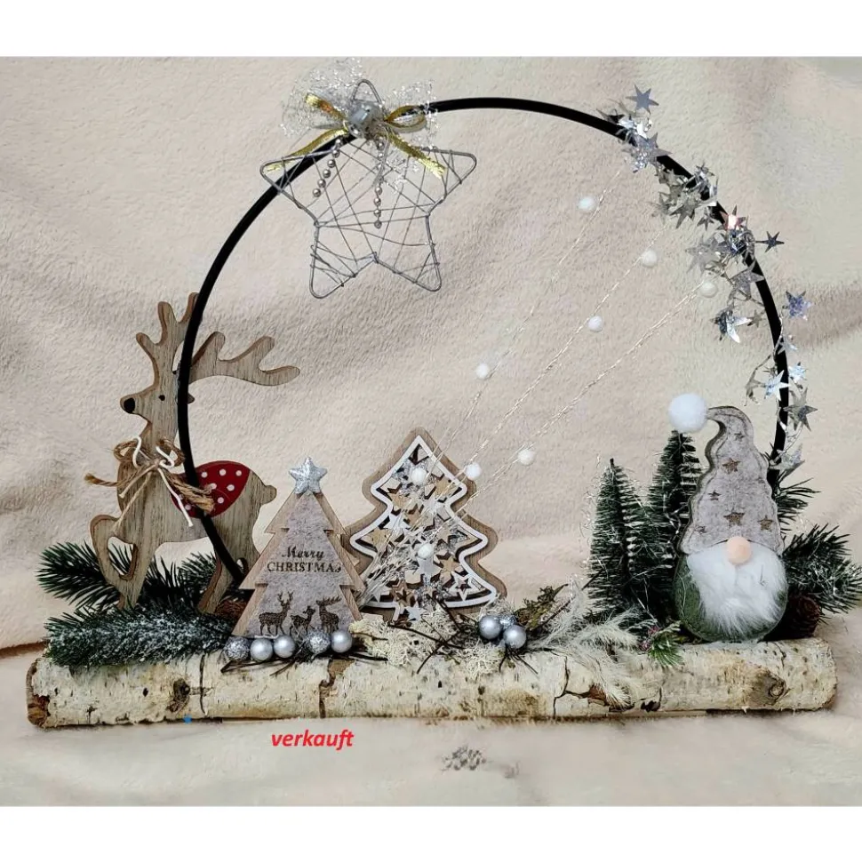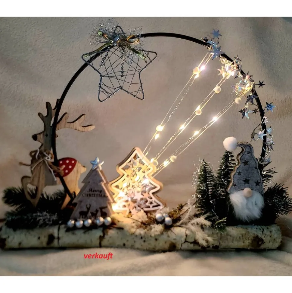 Du bekommst einen weihnachtlich geschmückten Metallring mit 30 cm Durchmesser, der auf ca. 40 cm langen Birkenästen steht. Die integrierte Beleuchtung sorgt für eine gemütliche Atmosphäre – Batterien sind bereits enthalten. So erhältst du eine ganz besondere Weihnachtsdekoration, die sich perfekt für dein Zuhause eignet oder sich wunderbar als Geschenk macht.