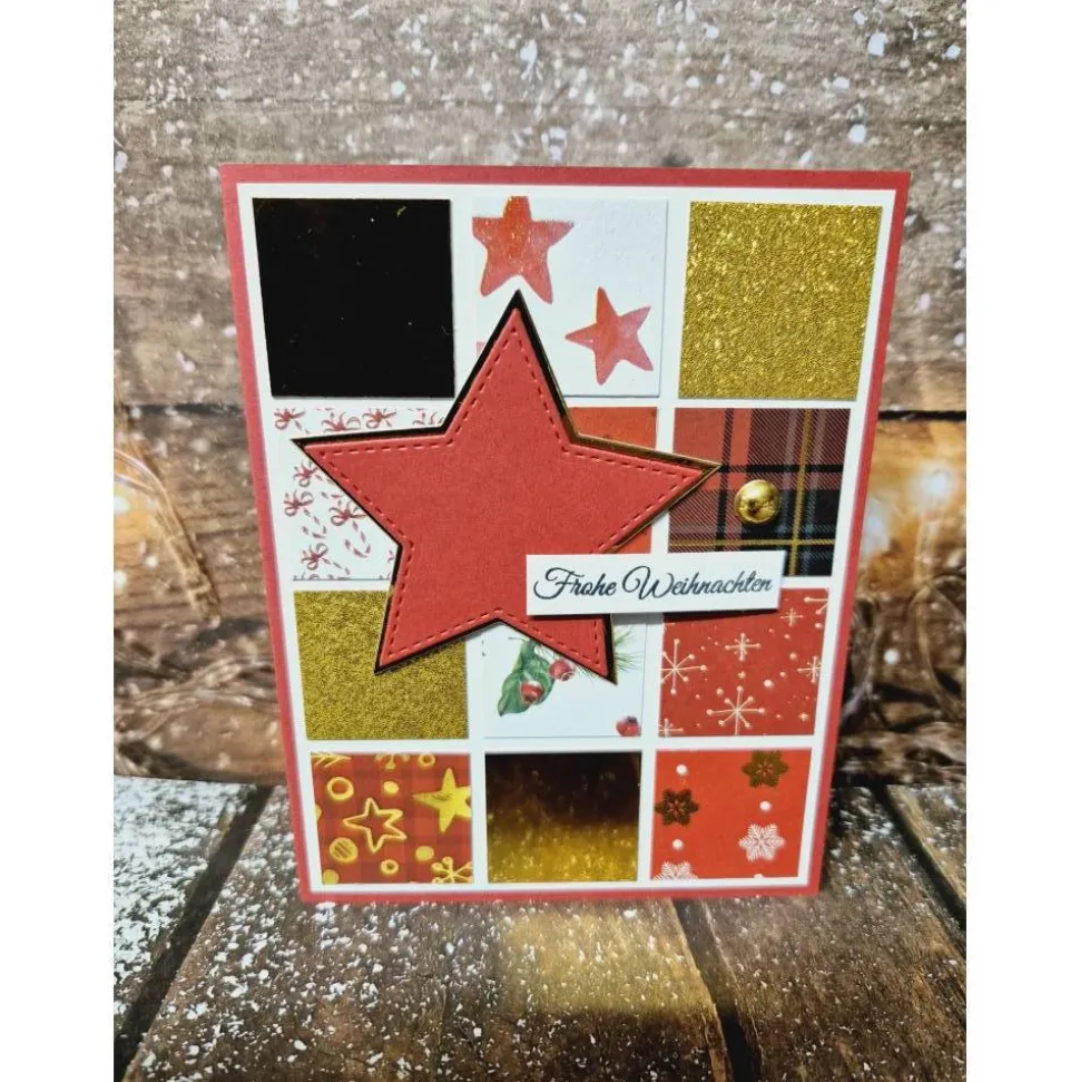 Überrasche deine Liebsten mit einer einzigartigen, handgefertigten Weihnachtskarte! Diese stilvolle Karte besticht durch detailreiche, weihnachtliche Motive: hochwertiges Motivpapier in Quadrate geschnitten, Stern rot gold sowie funkelndre Glitzerstein.