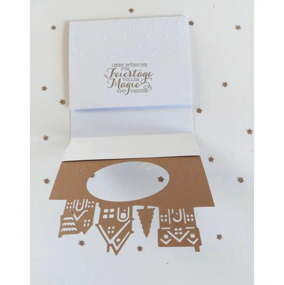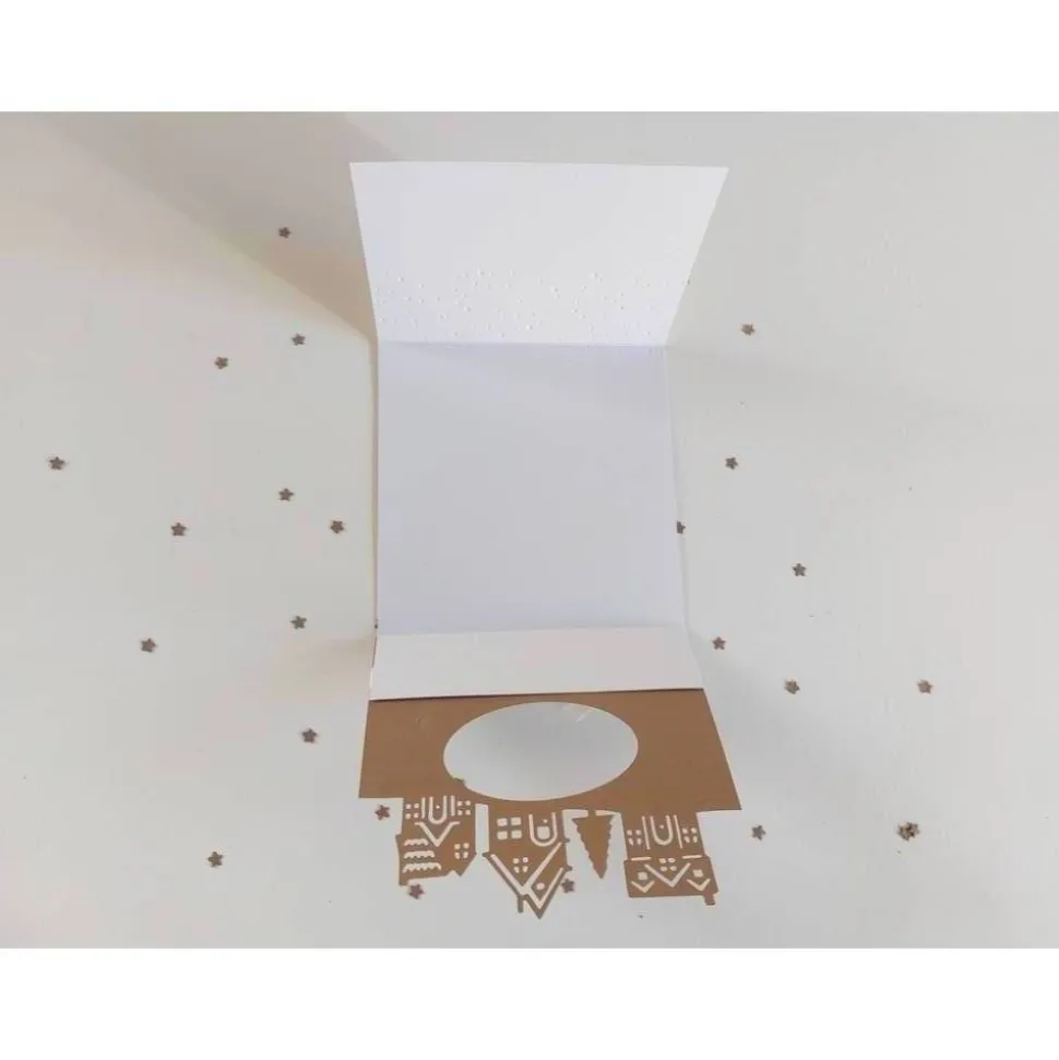 Entdecke eine eindrucksvolle Weihnachtskarte, die liebevoll in Handarbeit gefertigt wurde. Die quadratische Karte in weiß/braun mit Teilprägung bringt mit ihrer Dorflandschaft eine weihnachtliche Stimmung in dein Zuhause.
