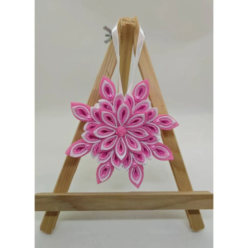 Ein liebevoll gefertigter Kanzashi-Anhänger, der mit seinen zarten Rosatönen sofort ins Auge fällt.