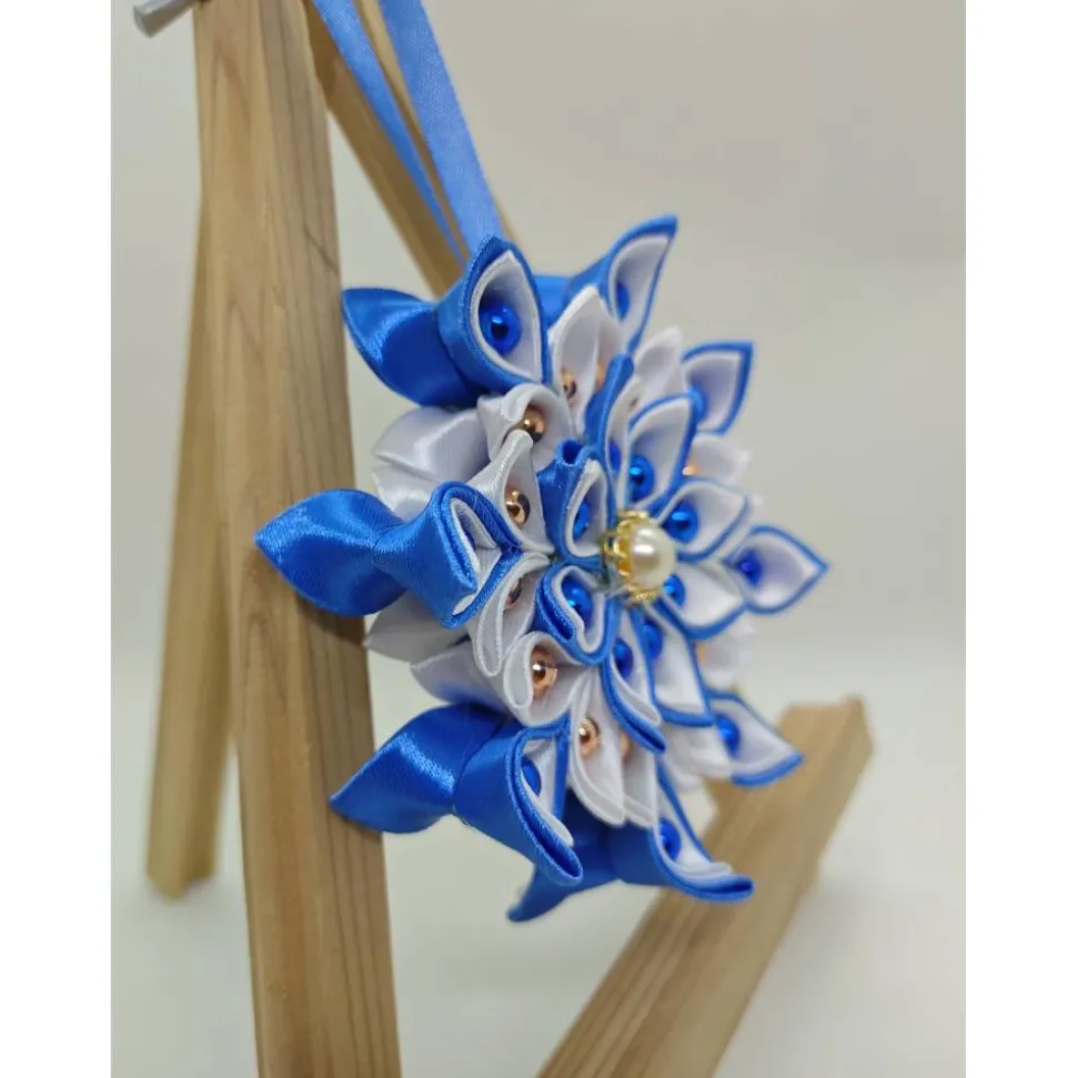 Leuchtendes Blau, schimmerndes Weiß und goldene Akzente vereinen sich zu einem harmonischen, festlichen Design. Die sorgfältig gefalteten Satinblätter und die glänzenden Perlen machen dieses Stück zu einem besonderen Blickfang – ob als Dekoration, Geschenk oder persönlicher Glücksbringer.