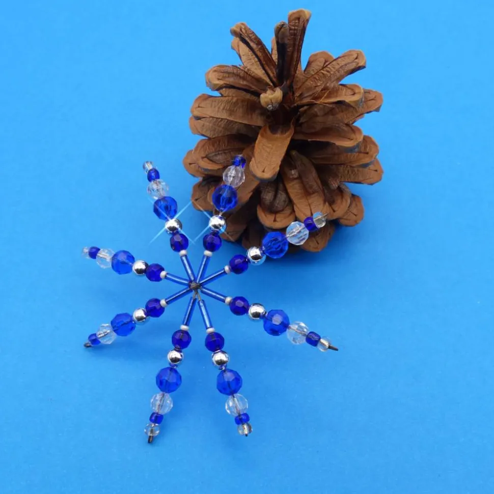 Perlenstern als stilvolle Fenste- oder Weihnachtsdekoration! Dieser wunderschöne Stern ist auf einen Drahtstern gefädelt und überzeugt durch hochwertige Glasperlen, Acrylperlen und Rocailles in glänzenden und facettierten Farben – blau, silber und transparent.