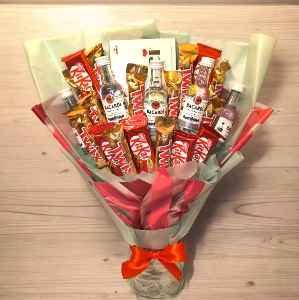 Verleihen Sie Ihren festlichen Anlässen eine exklusive Note mit unserem handgefertigten Genussstrauß. Dieses einzigartige Arrangement besteht aus fünf Miniaturflaschen des edlen Bacardi Rums, delikaten Twix Minis und Kitkat Minis, köstlichen Merci Schokoladentäfelchen und ist kunstvoll in exklusiven Satinfolien verpackt.