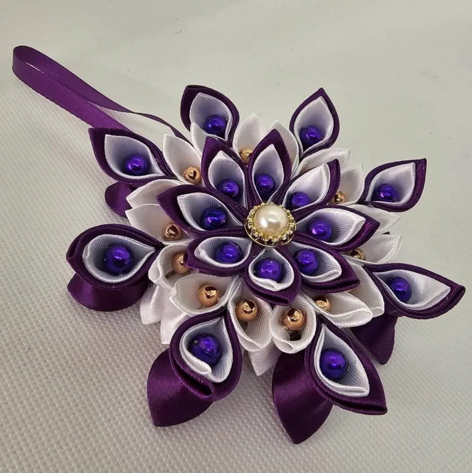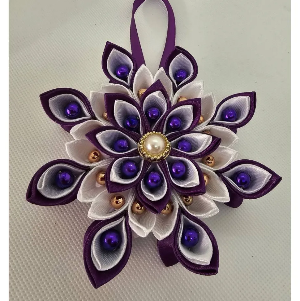 Das aufwendige Kanzashi-Muster und die detailverliebte Anordnung der Perlen in Lila und Gold verleihen dem Stern eine luxuriöse und dennoch verspielte Ausstrahlung. Dank des beidseitig identischen Designs ist der Weihnachtsstern von jeder Perspektive ein echter Hingucker.