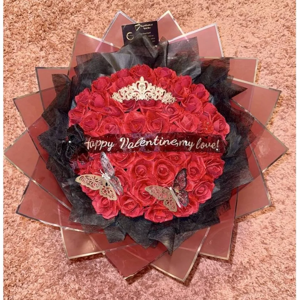 Besonderes Design: Die aufwendige, mehrlagige Verpackung aus rotem koreanischen Papier mit edler Silberkante und dekorativen Elementen wie Schmetterlingen, einer zierlichen Krone sowie einem individuell gestaltbaren Schriftband („Happy Valentine, my love!“) machen den Strauß zu einem einzigartigen Unikat. Den Schriftzug kannst du nach Wunsch personalisieren und so das Bouquet zu einem ganz individuellen Geschenk machen.