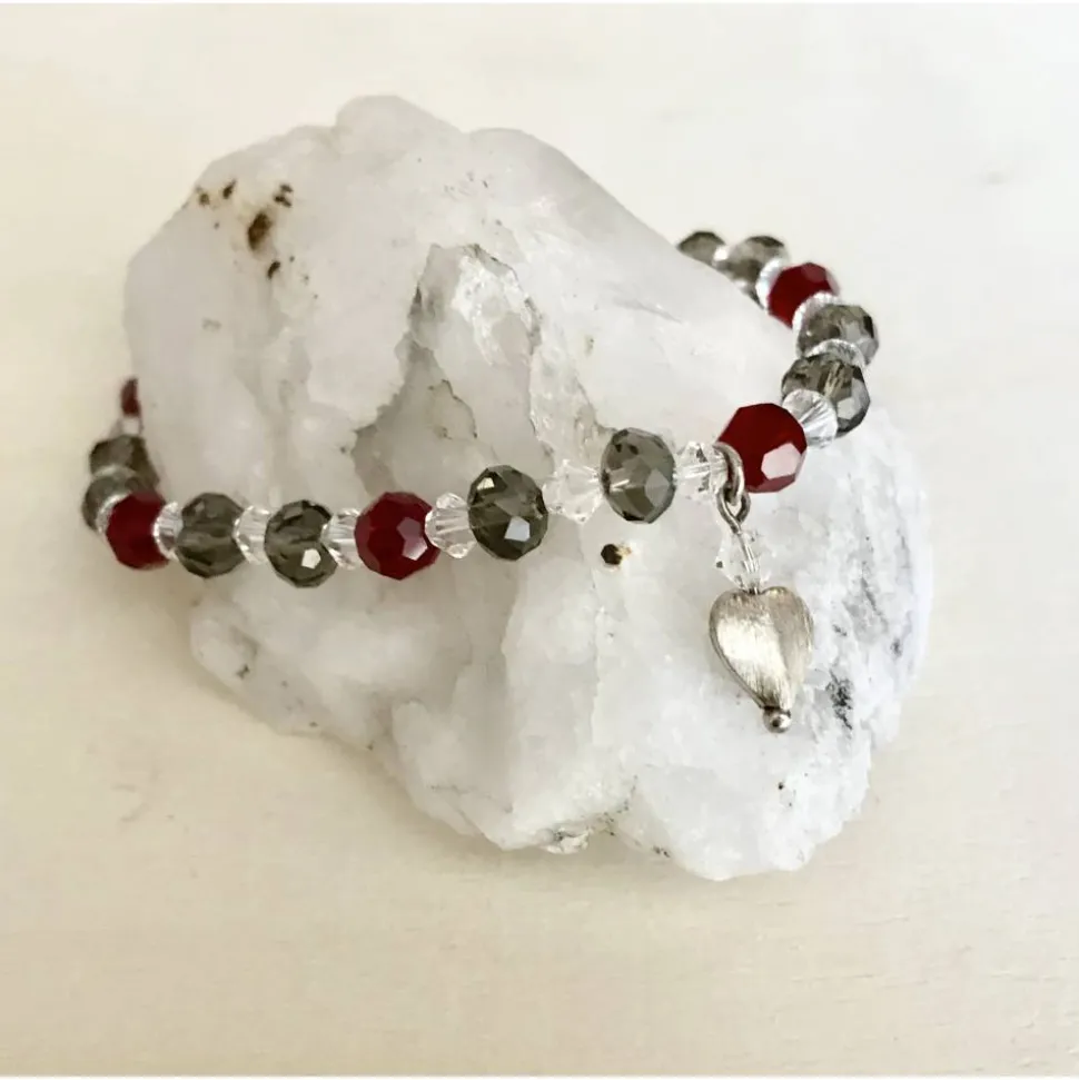 Mit diesem handgefertigten Armband aus wunderbar funkelnden, konischen (Doppelkegel) und hochwertigen Kristallperlen eines namhaften Unternehmens in grau und rot mit einem 925-Sterlingsilbernem Herzl-Anhänger glänzt Du ganz bestimmt!