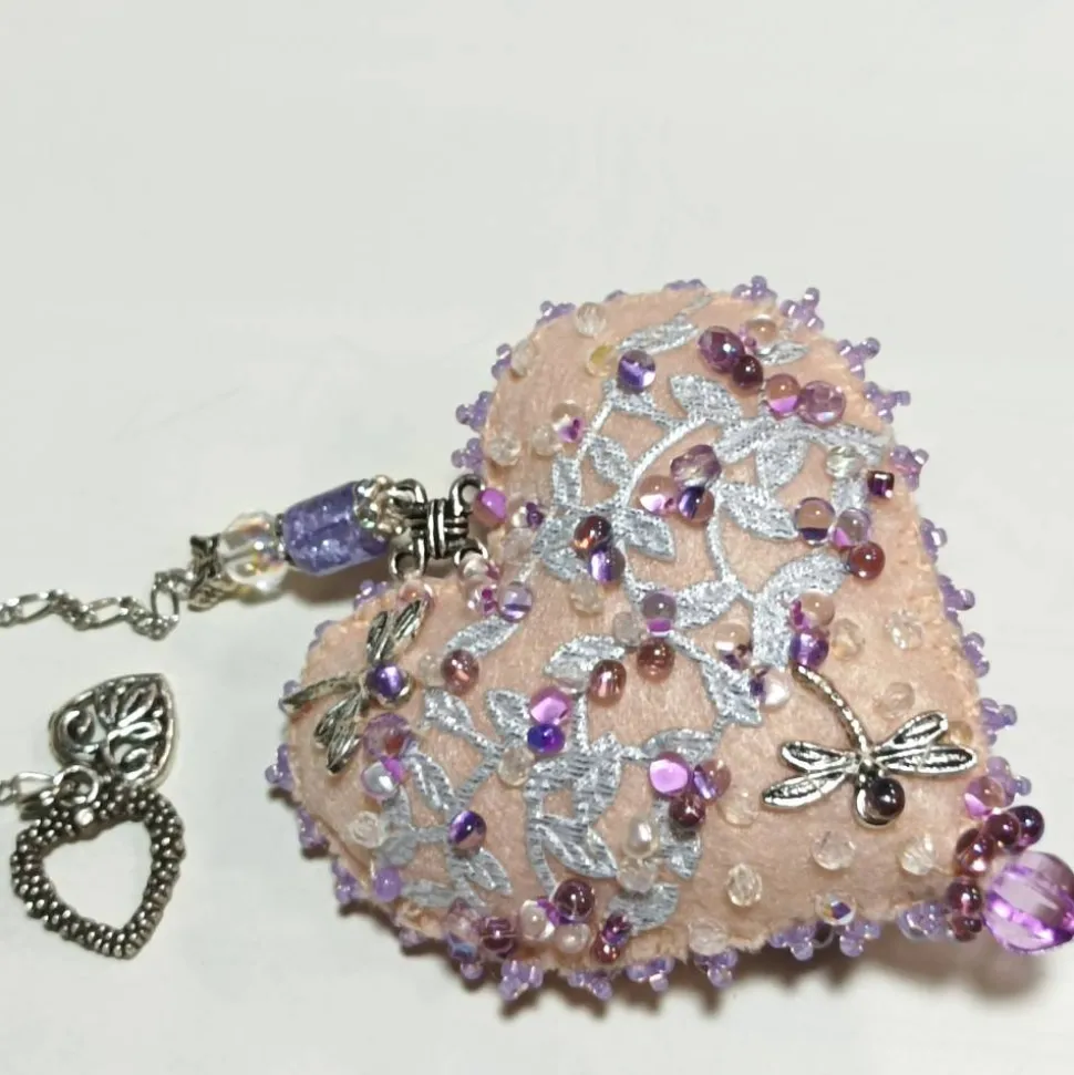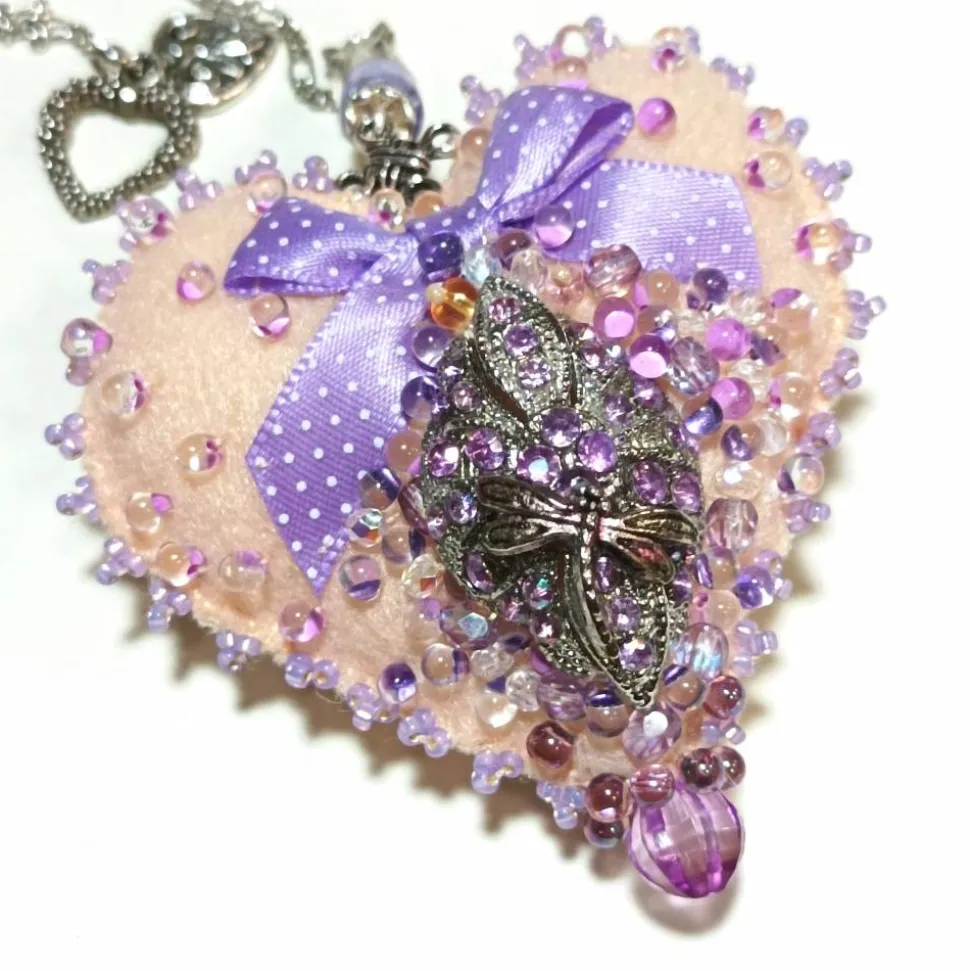 - Herz flieder lila violett: Mit Libelle auf Strasssteinchen, rosafarbenen Biwaperlen und Glastropfen auf Spitze auf der Rückseite, ca. 7,5 cm x 7,5 cm, 2 cm hoch, Gesamtlänge mit Kettchen 23 cm
