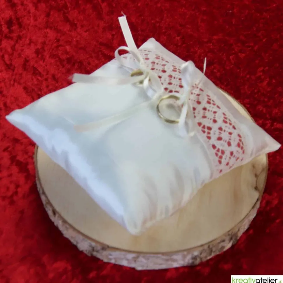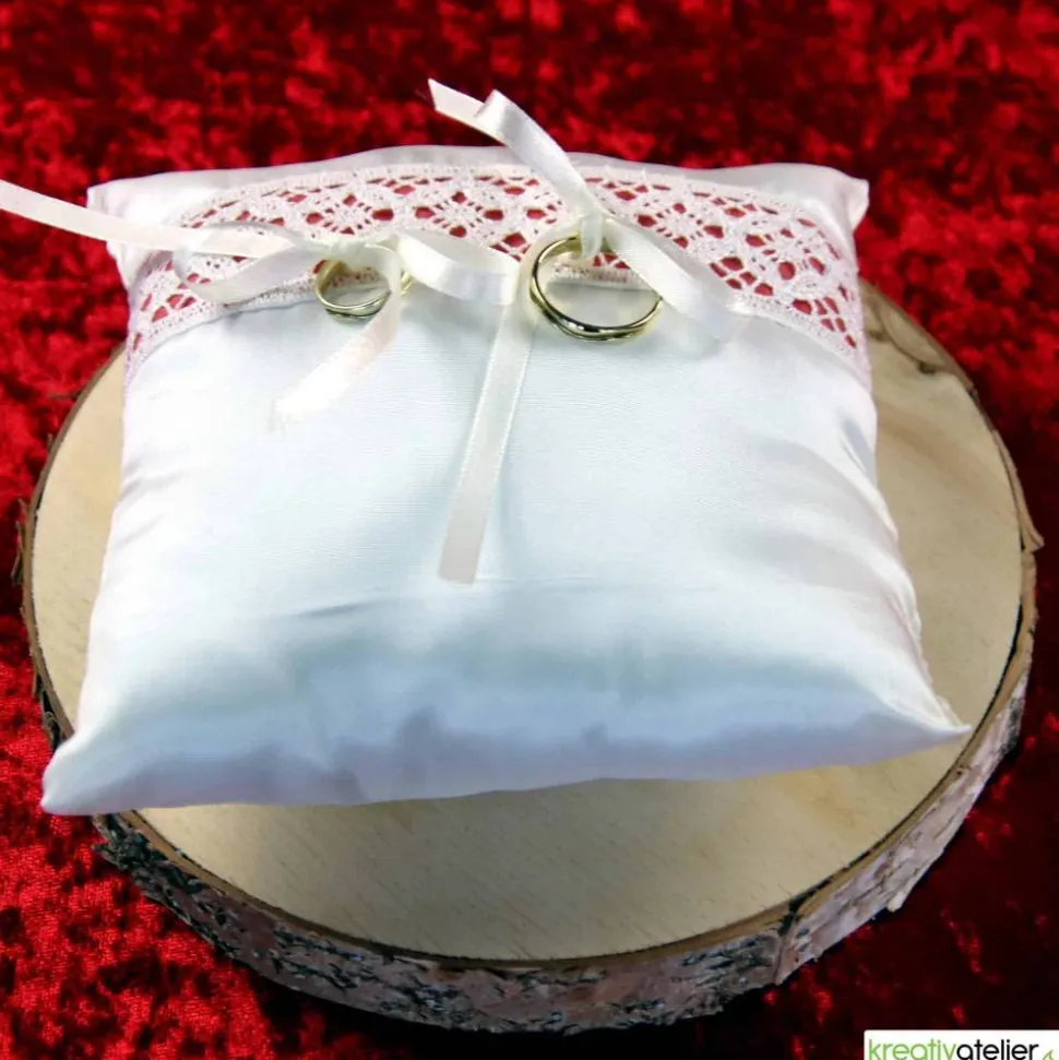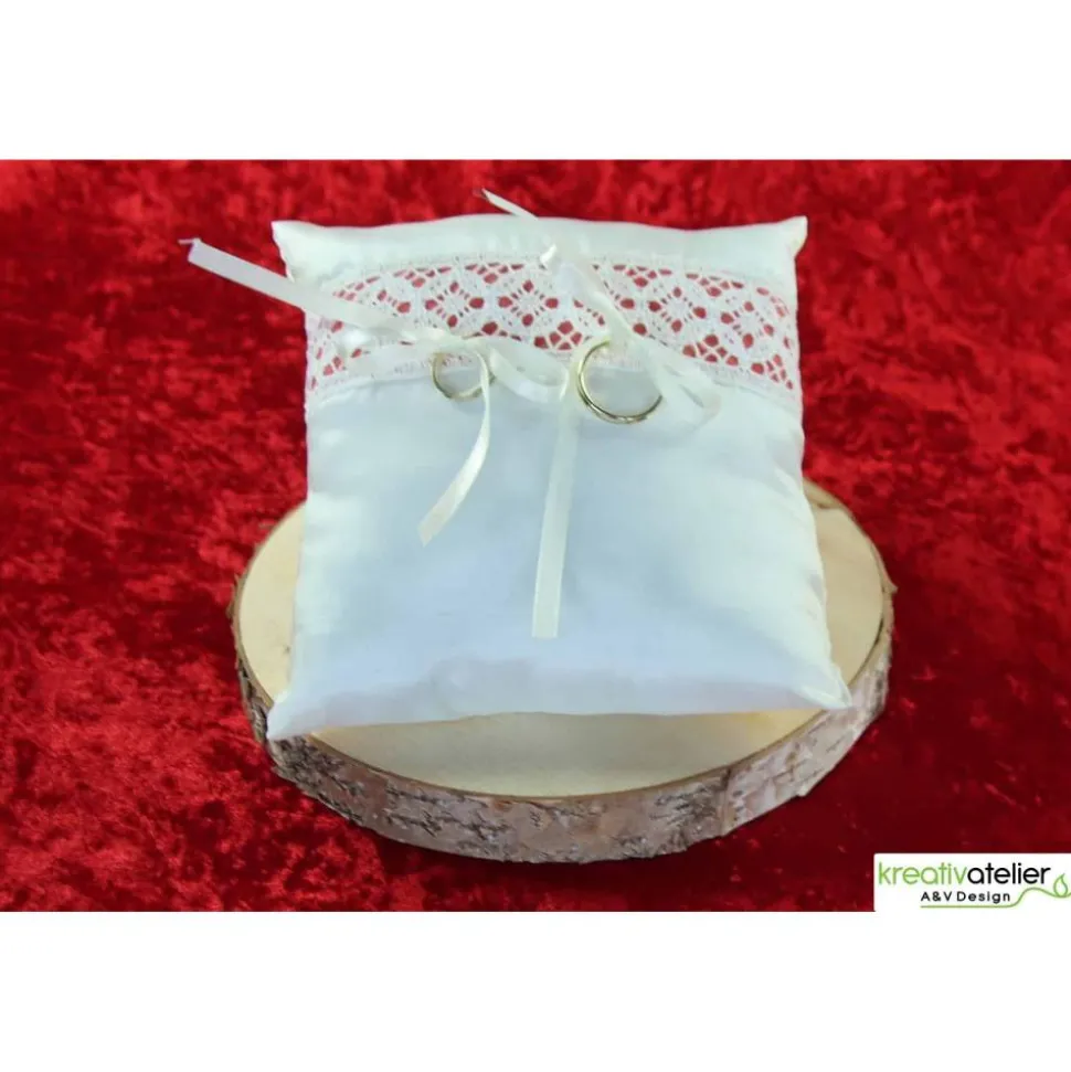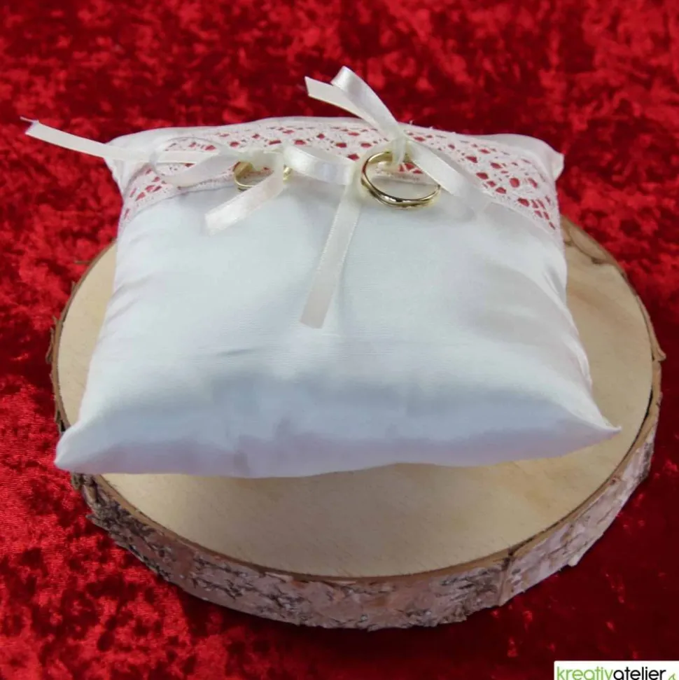 Die Oberfläche des Kissens ist durch die zarte, mit hellrotem Baumwollstoff unterlegte Klöppelspitze veredelt, die nicht nur einen farbigen Kontrast bietet, sondern auch die Einzigartigkeit Ihrer Trauringe oder Eheringe hervorhebt. Die feinen Satinbänder, mit denen Ihre Ringe schick und sicher befestigt werden, sind ein Versprechen von Beständigkeit und Hingabe. Auf diesem Kissen liegen Ihre Ringe bereit für ihren großen Auftritt, strahlend und voller Bedeutung.
