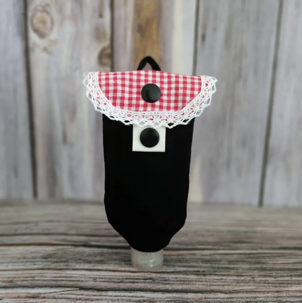 Die Kombination aus schwarzem Stoff mit einer rot-weiß karierten Klappe und verspielter Spitzenborte macht „Susi“ zu einem Accessoire mit Vintage-Charme. Dank Druckknopf-Verschluss bleibt dein Fläschchen sicher verstaut.