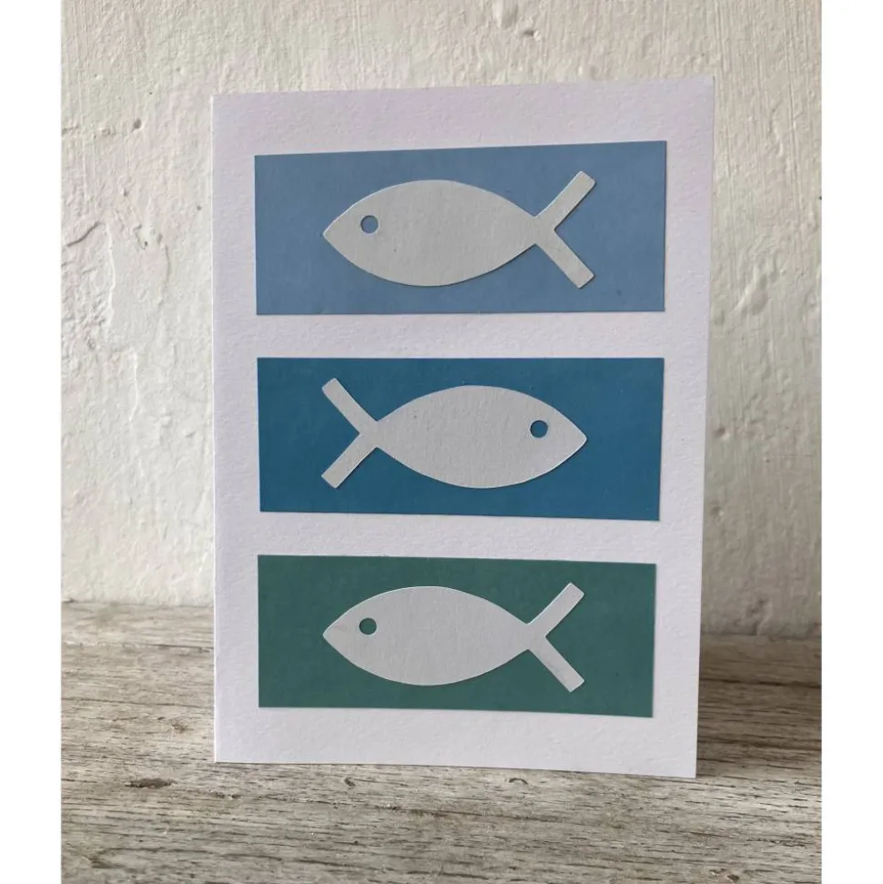 Die Klappkarte hat das Format DIN A 6 und ist mit farbigem Tonpapier und weißen Fischen beklebt. Die Karte besteht aus gekörntem Cardstock mit einem Gewicht von 140 g/m2.
