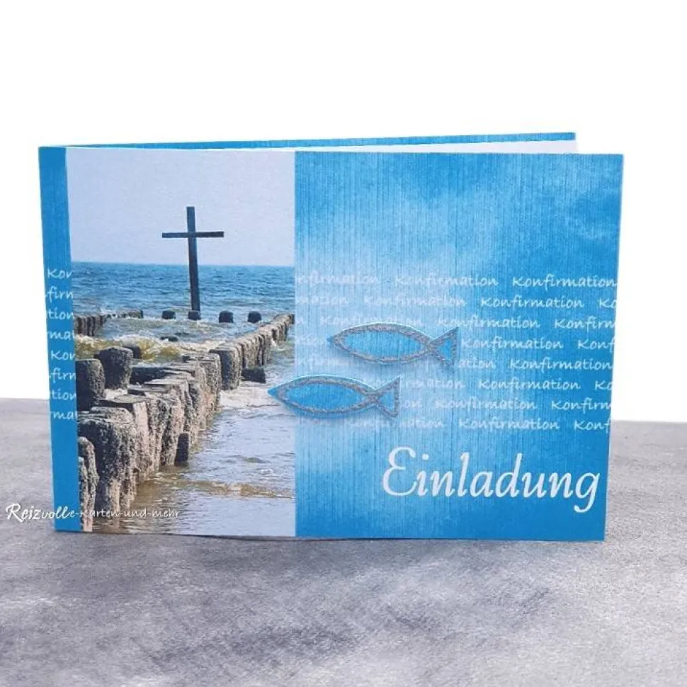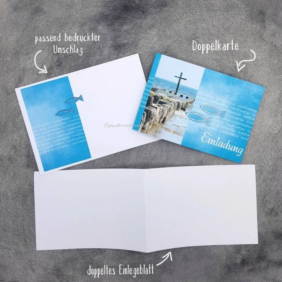 Gestalte deinen besonderen Tag mit einer einzigartigen Einladungskarte! Die Einladungskarte „Kreuz im Meer“ ist sowohl innen als auch außen liebevoll handgefertigt und eignet sich perfekt für Konfirmation, Kommunion oder Firmung. Der Schriftzug im Hintergrund wird nach deinem Wunsch angepasst, sodass die Karte individuell auf deinen Anlass abgestimmt ist.