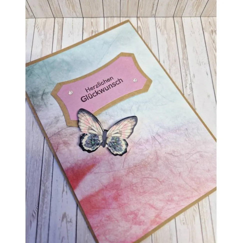Der Aufleger ist mit detaillierten Stanzteilen, einem eleganten Schmetterling und zwei funkelnden Strasssteinchen verziert. Die Aufschrift „Herzlichen Glückwunsch“ macht diese Karte zum perfekten Begleiter für jeden besonderen Anlass.