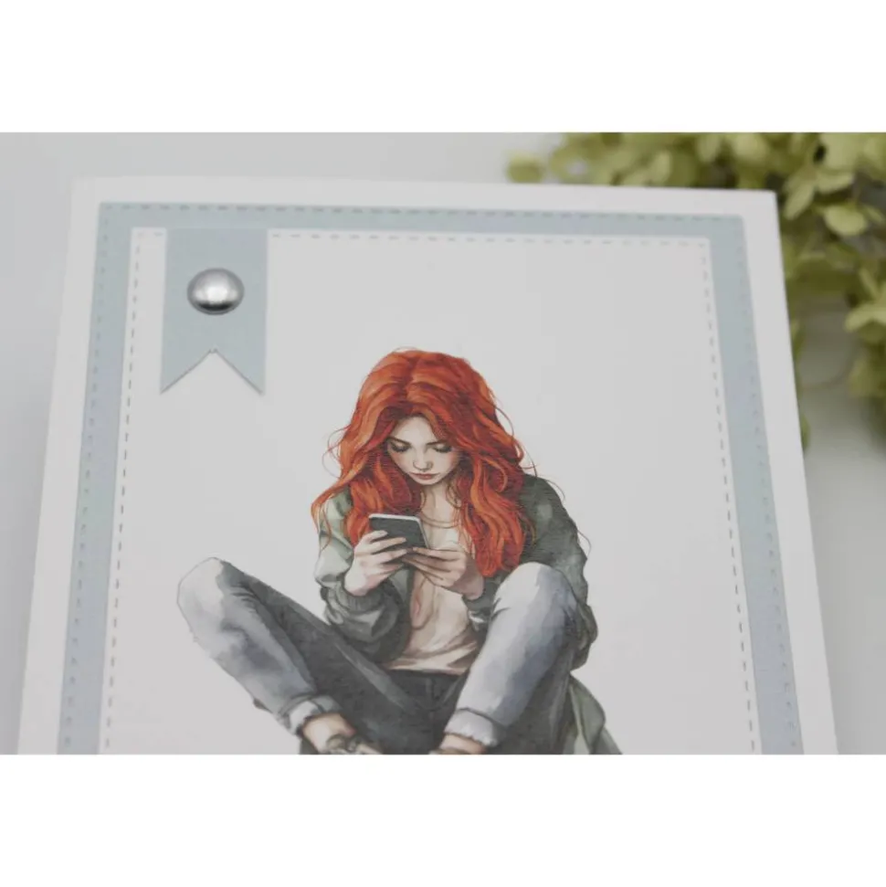 Im Mittelpunkt steht ein rothaariges Mädchen im lässigen Outfit, vertieft in ihr Smartphone – ein zeitgemäßes Symbol für deine Glückwünsche zum Start in einen neuen Lebensabschnitt.