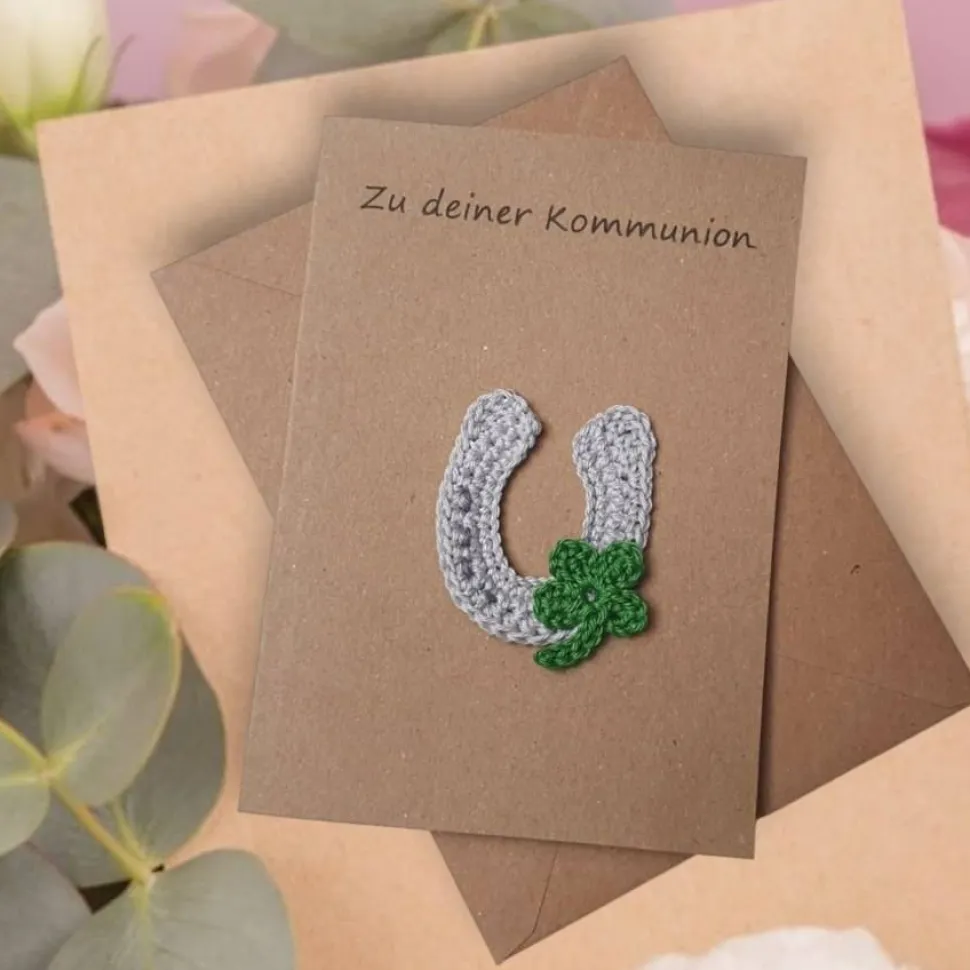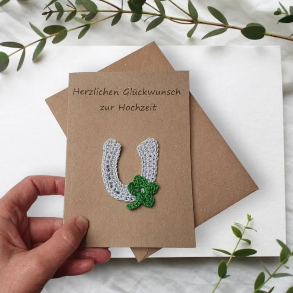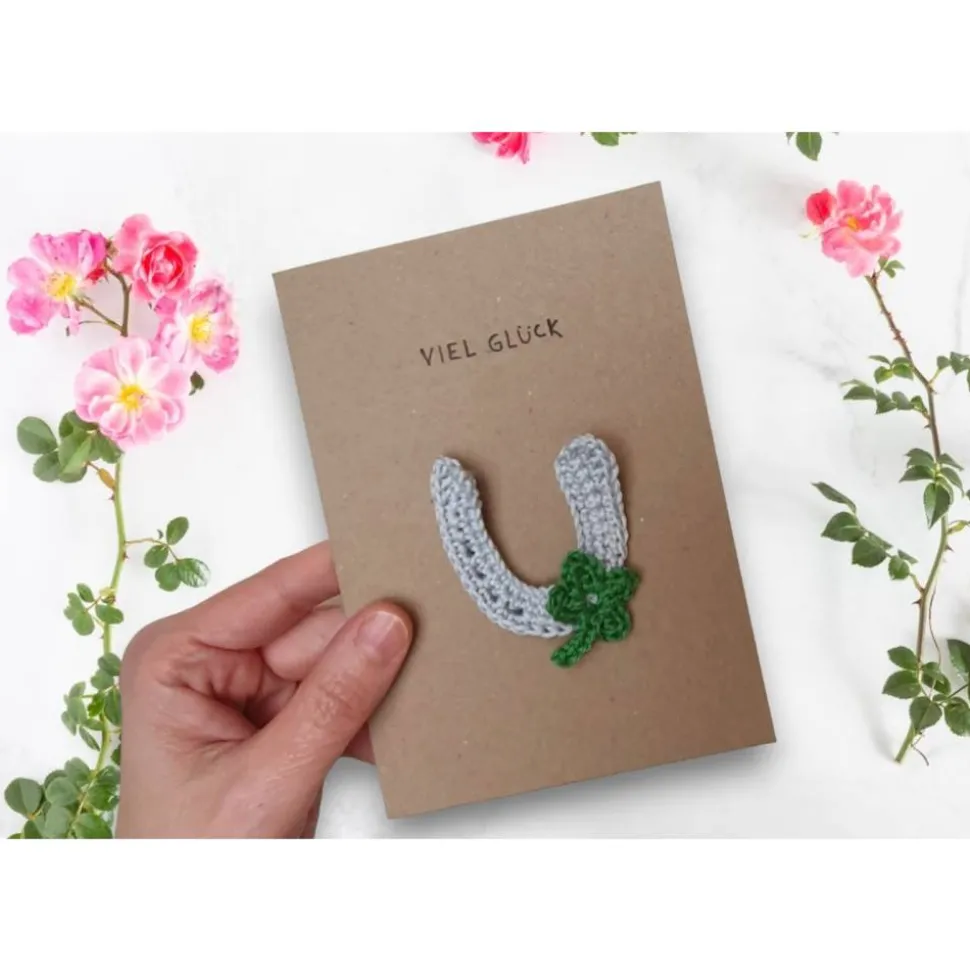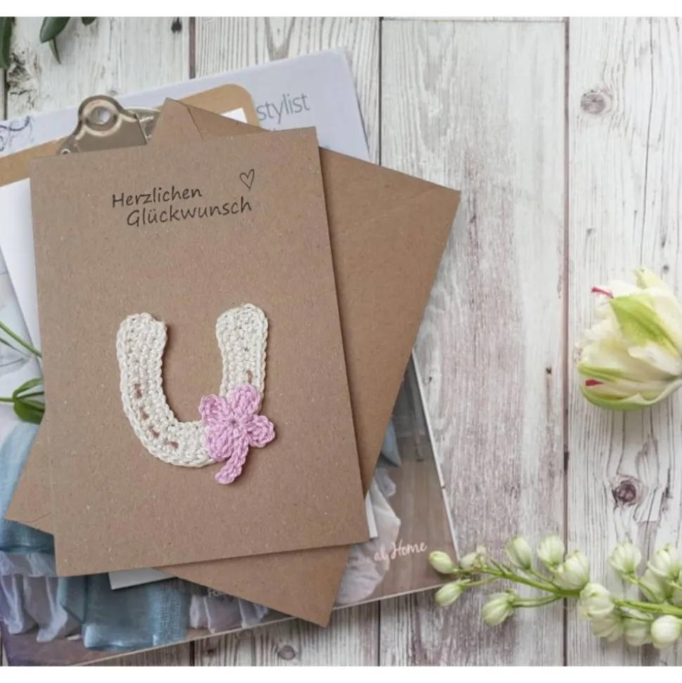 Diese liebevoll gestaltete Glückwunschkarte aus Kraftpapier ist mit einem gehäkelten Hufeisen und einem Kleeblatt verziert. Sie ist nicht nur ein Blickfang, sondern auch ein Glücksbringer, der zu jedem Anlass passt – als Geburtstagskarte für Pferdefreunde, Gutschein für Reitstunden oder als persönliche Grußkarte.