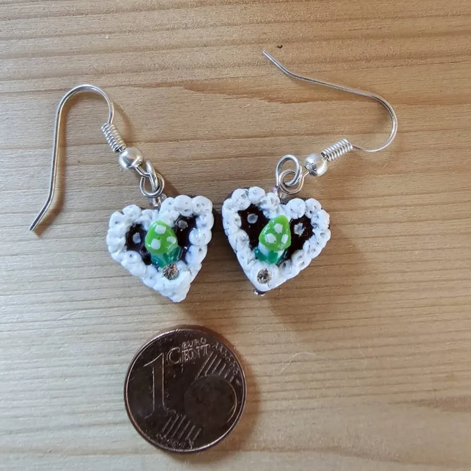 Jedes Lebkuchenherzchen ist individuell mit Zuckerguss, einem Glückspilz und einem hochwertigen, glitzernden Strasssteinchen verziert. Durch die Handmodellierung sieht jedes Stück etwas anders aus und macht deinen Schmuck zu einem echten Unikat.
