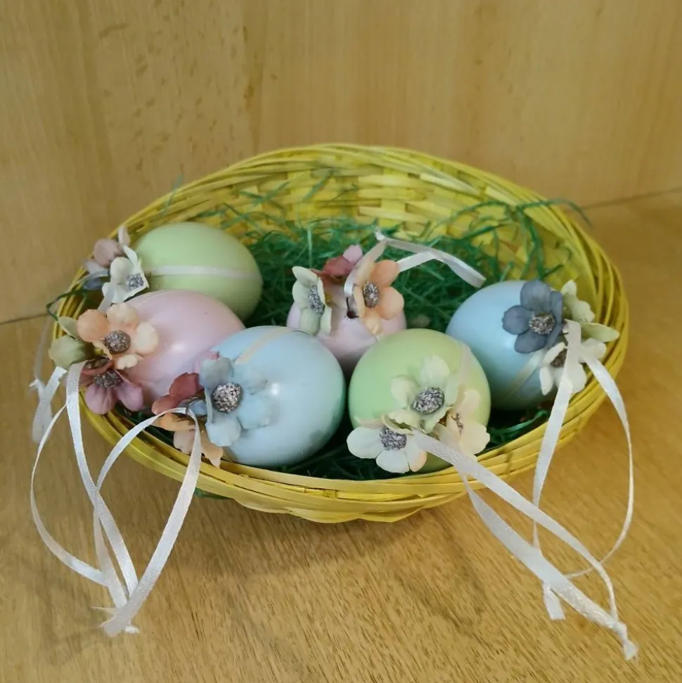 Bringen Sie mit diesen pastellfarbenen Ostereiern mit Blüten eine elegante und frühlingshafte Atmosphäre in Ihr Zuhause! Die liebevoll, handgemachten Ostereier sind mit einem zarten weißen Satinband und dekorativen Blütenapplikationen verziert – eine perfekte Kombination aus zeitloser Eleganz und verspieltem Frühlingsflair.