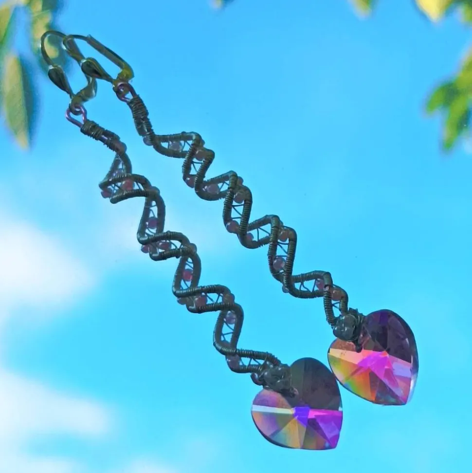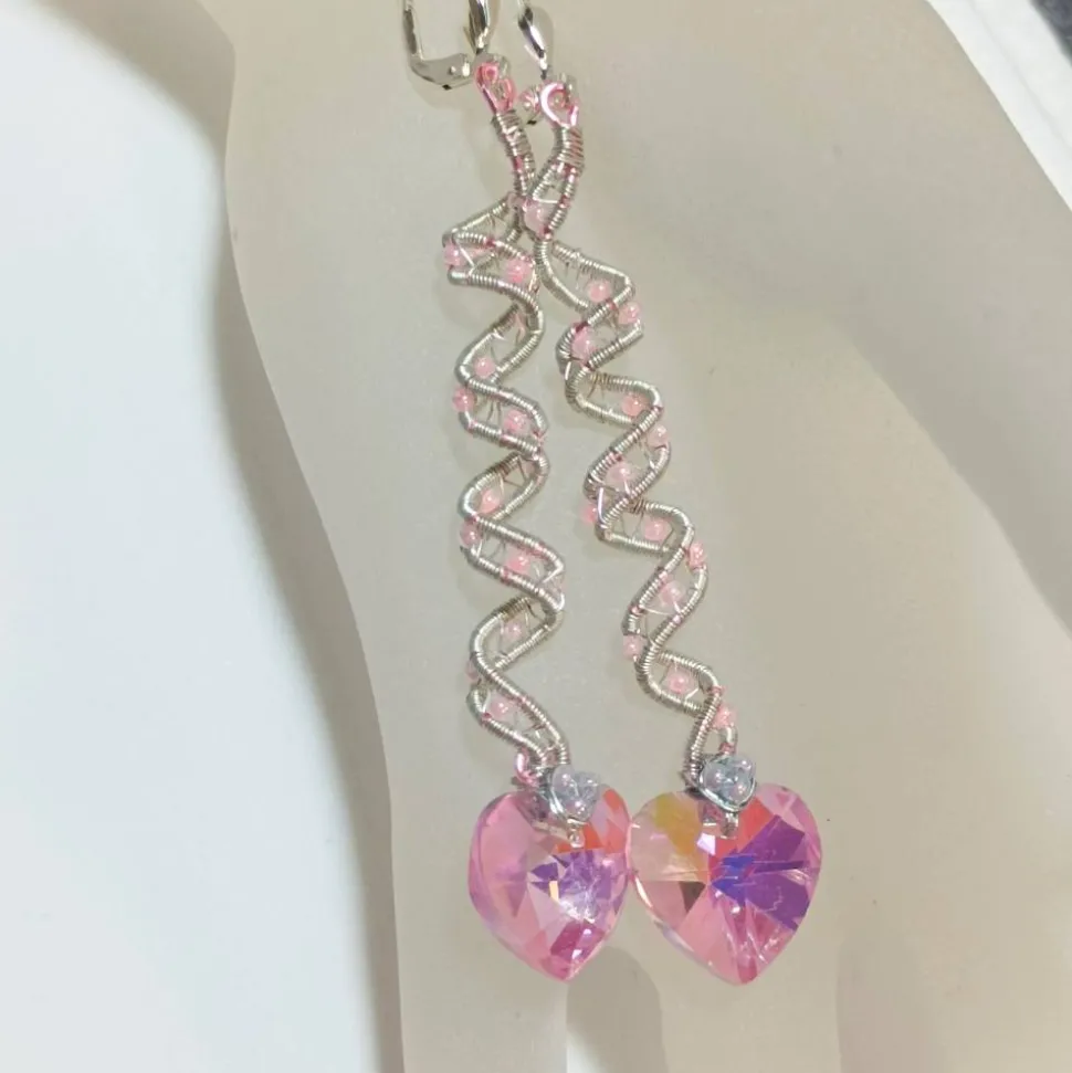 Entdecke märchenhafte, handgemachte Ohrringe als bezaubernden Brautschmuck! Diese romantischen langen Ohrringe sind als Spiralperlen in wirework zweifarbig silberfarben auf rosa metallic von Hand gewebt und mit kleinen, schimmernden Glasperlen in pastellrosa sowie facettierten, funkelnden Herzen in rosé mit Regenbogenschimmer verziert. Sie setzen einen traumhaften Akzent zum vintage Brautkleid, Boho-Look oder zu einer Regenbogenhochzeit.
