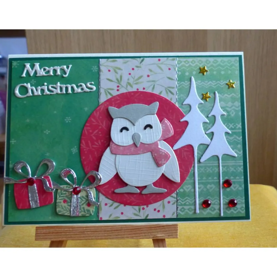wurde die Karte mit eine Eule,Tannenbäume,kleine Geschenk in 3 D