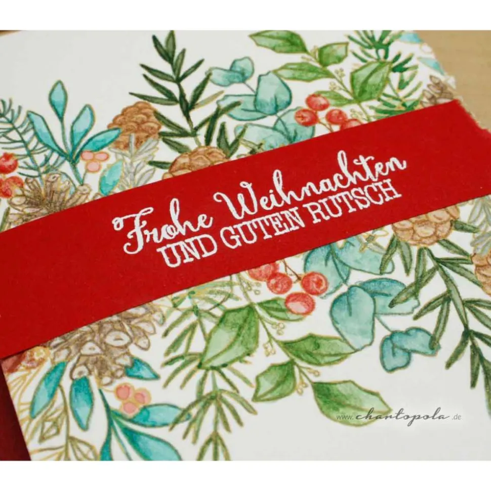 Auf der Vorderseite habe ich feine Tannenzweige von Hand gestempelt und anschließend sorgfältig mit Aquarellfarben und Buntstiften koloriert. Durch diese Technik entsteht ein lebendiger Eindruck, der fast so wirkt, als könnte man den Duft des frischen Grüns erahnen.