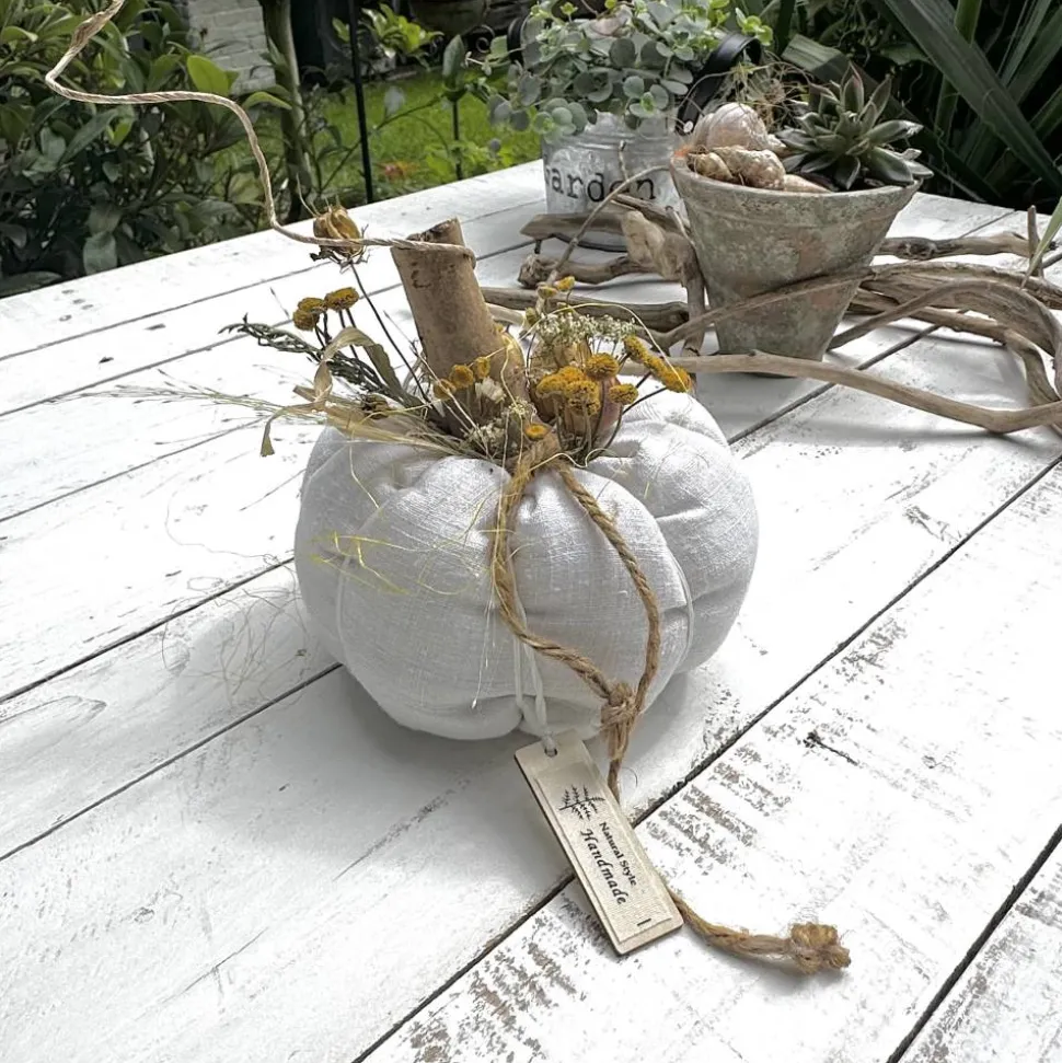Maße: Durchmesser Ø18cm, Höhe mit Holzstiel ca. 17 cm, Umfang 47cm. Der Kürbis ist aus 100% antikem, feingewebtem Leinen gefertigt und mit Flockenwatte gefüllt. Eine Birkenholzscheibe an der Unterseite sorgt für einen stabilen Stand.