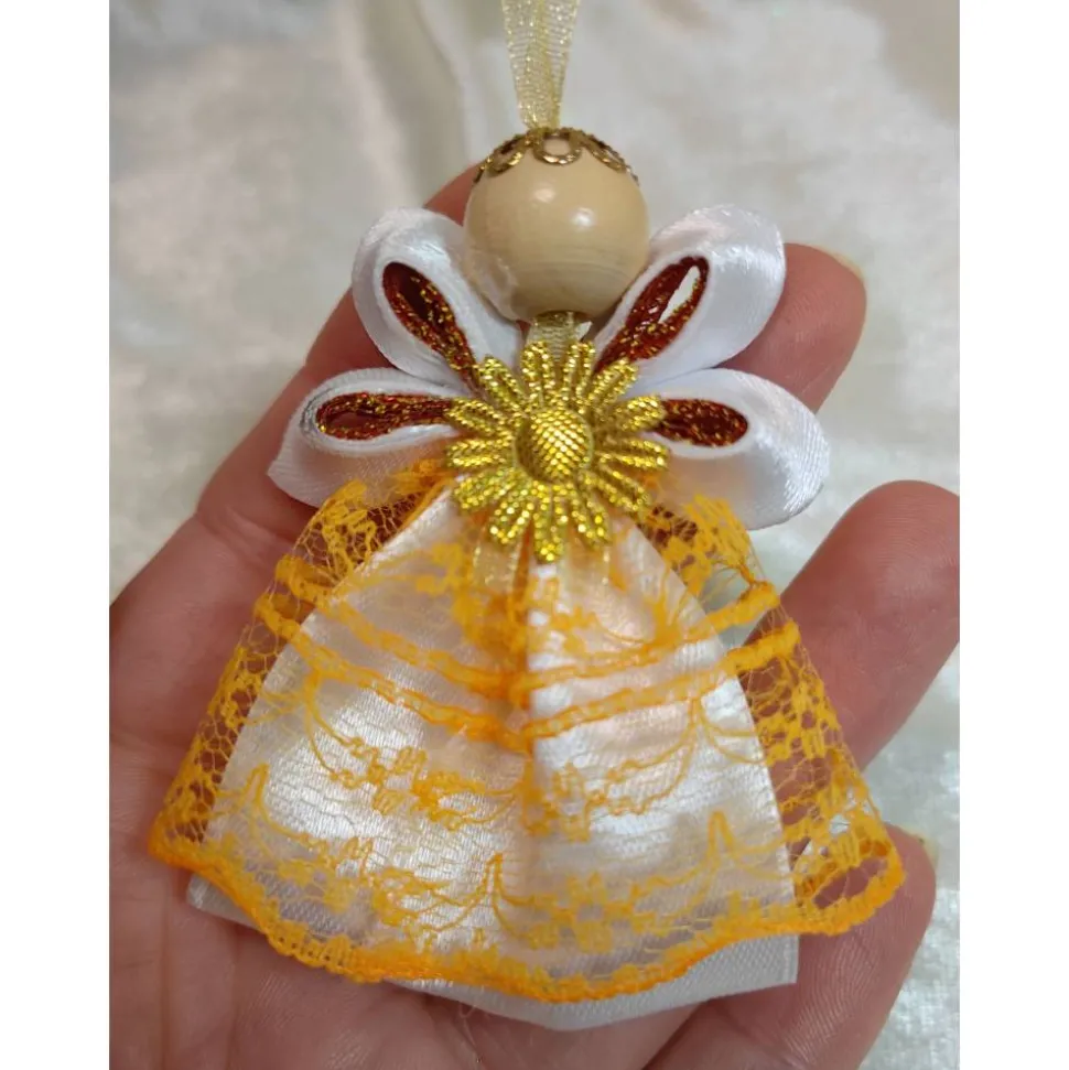 Die funkelnden orangefarbenen Flügel, das harmonisch passende Spitzenkleid und die liebevoll gefertigte Holzperle machen ihn zu einem echten Hingucker. Perfekt als Christbaumschmuck, für Fensterdekorationen oder als kleiner Schutzengel-Geschenkanhänger.
