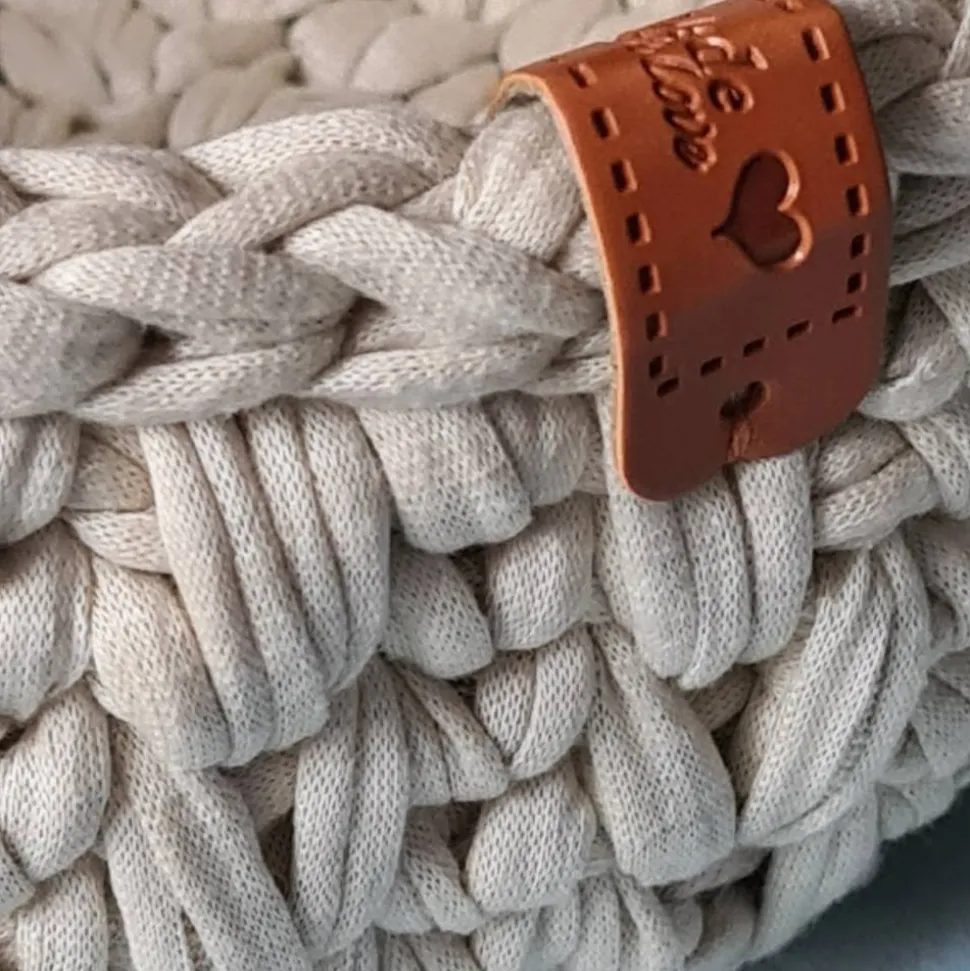 Das Körbchen wurde mit einer Häkelnadel der Stärke 8 aus elastischem, beigem Textilgarn gefertigt. Es lässt sich per Handwäsche reinigen; forme es im nassen Zustand einfach wieder zurecht. Bitte beachte, dass das Körbchen aufgrund seiner Dicke länger zum Trocknen benötigt und nicht in den Trockner gegeben werden sollte.