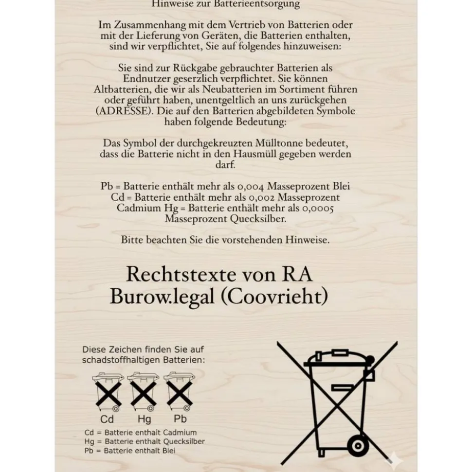 • ⚠️ Symbol „durchgestrichene Mülltonne“ = keine Entsorgung im Hausmüll