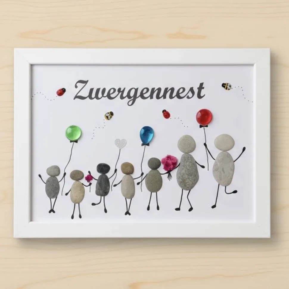 Dieses besondere Bild zeigt mehrere Figuren aus echten Natursteinen, die gemeinsam fröhlich beisammenstehen, ergänzt durch bunte Ballons, kleine Details und einen individuell anpassbaren Kita-Namen (z. B. Zwergennest).