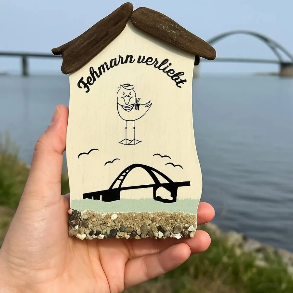 Die natürliche Maserung und die individuellen Unebenheiten des Holzes verleihen jedem Häuschen seinen besonderen Charakter. Das detailreiche Design vereint die maritime Schönheit der Fehmarn Brücke, eine charmante Möwe mit „Moin“-Gruß und das farbenfrohe Meer mit dem Schriftzug „Fehmarn verliebt“.