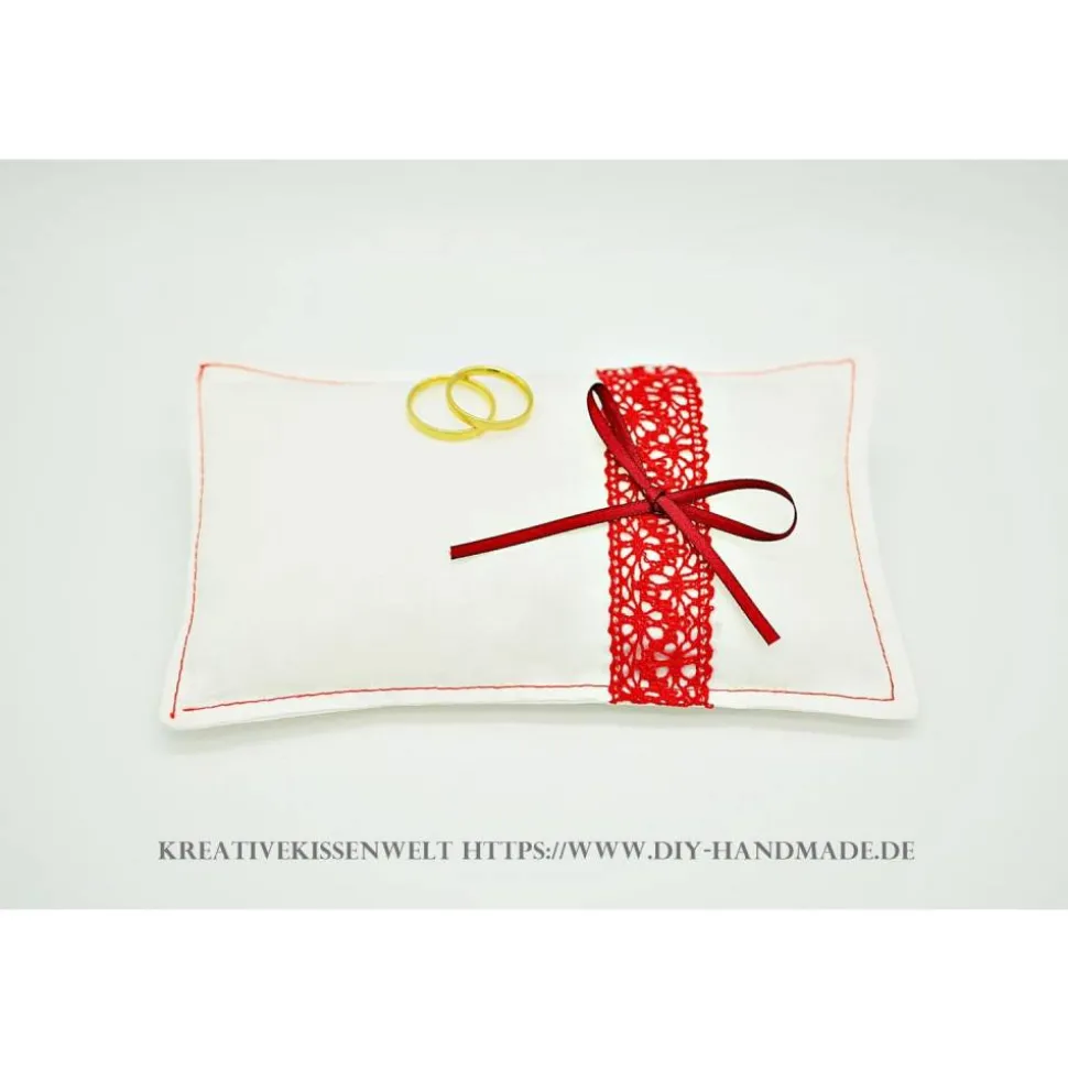 Dieses weiße Ringkissen mit roter Spitze ist das perfekte Accessoire für deine Hochzeit oder Trauung.