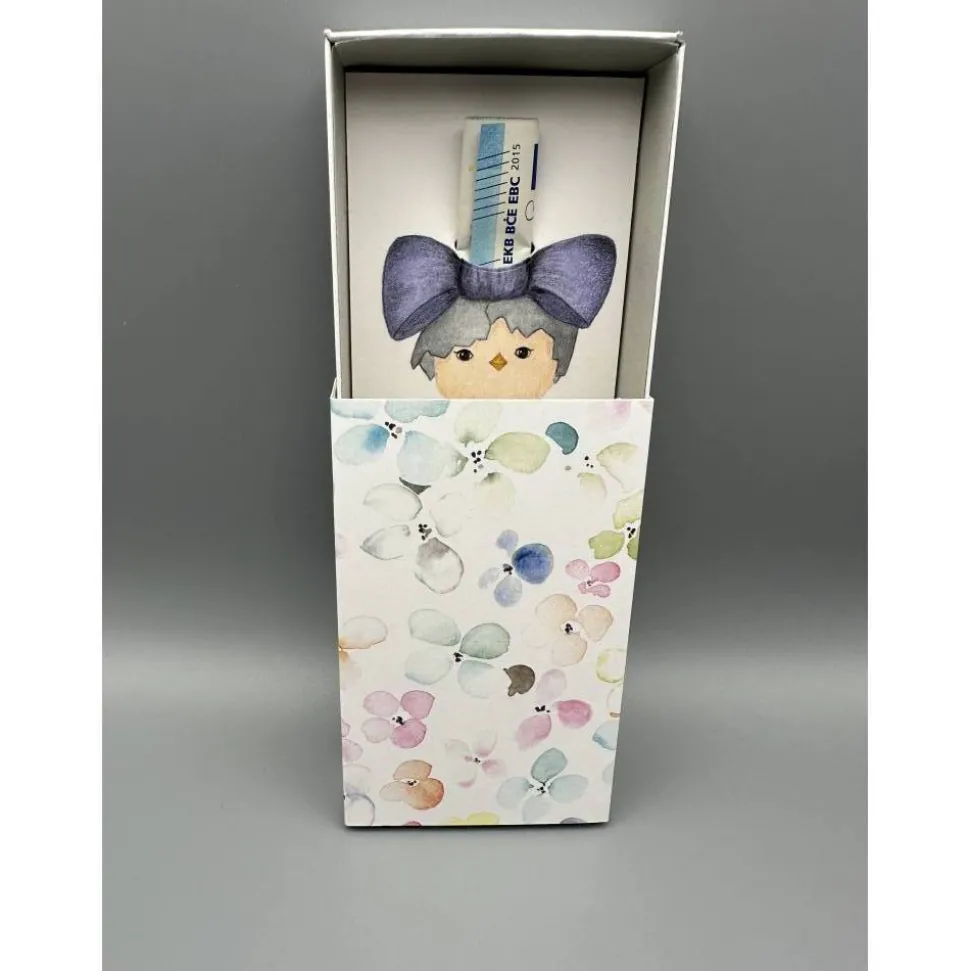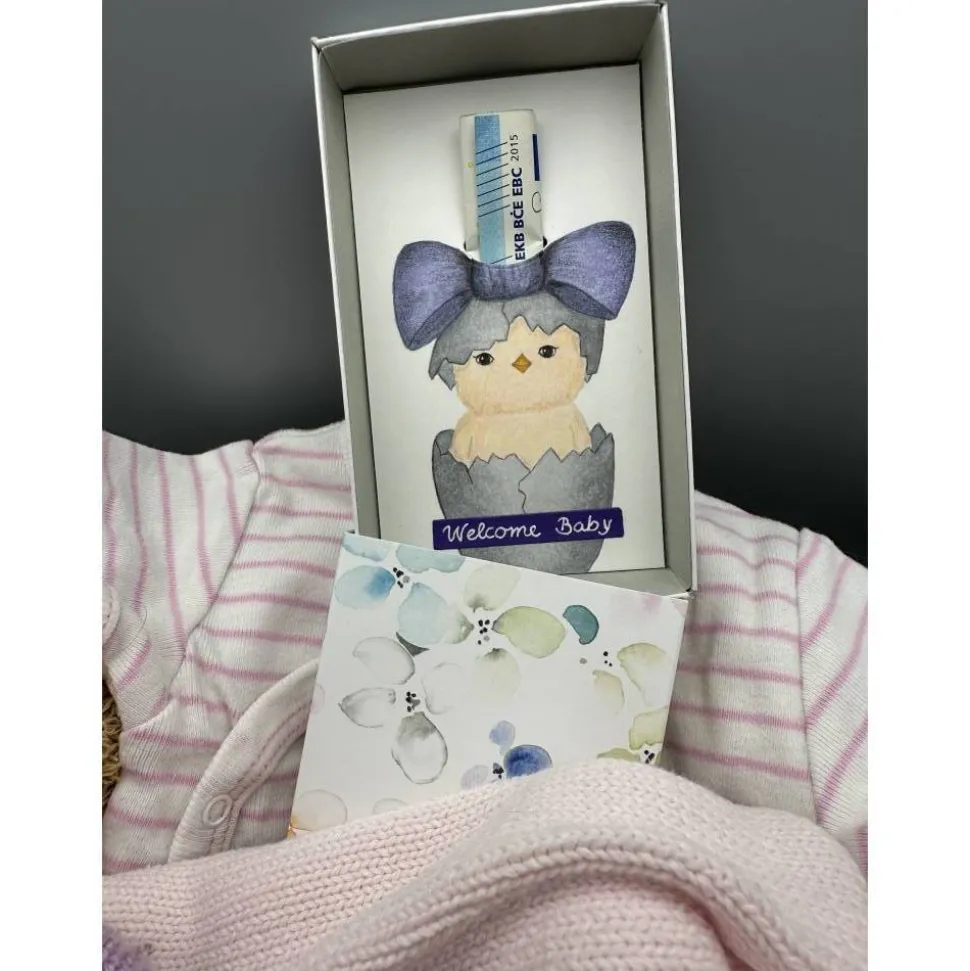 Entdecke die einzigartige, handgemalte Geschenkbox zur Geburt – Welcome Baby! Diese liebevoll gestaltete Geschenkschachtel zeigt ein niedliches pastellfarbenes Küken, das aus dem Ei schlüpft und eine große fliederfarbene Schleife auf dem Kopf trägt. Der farblich passende „Welcome Baby“-Schriftzug macht die Box zu einem besonderen Highlight für frischgebackene Eltern.