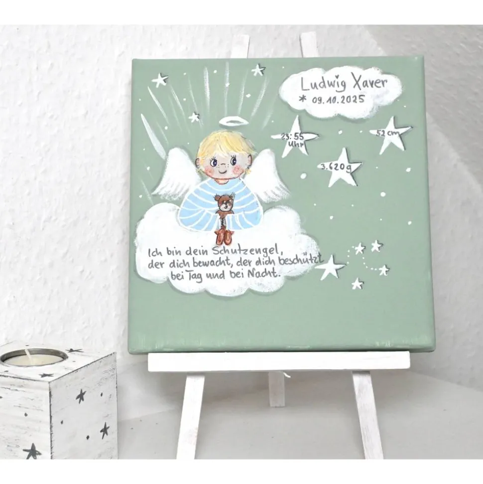 Suchen Sie ein einzigartiges Taufgeschenk für einen Jungen? Dieses handgemalte Schutzengelbild mit Teddy – ist ein bezauberndes Geschenk, das Herzen berührt! 🙂
