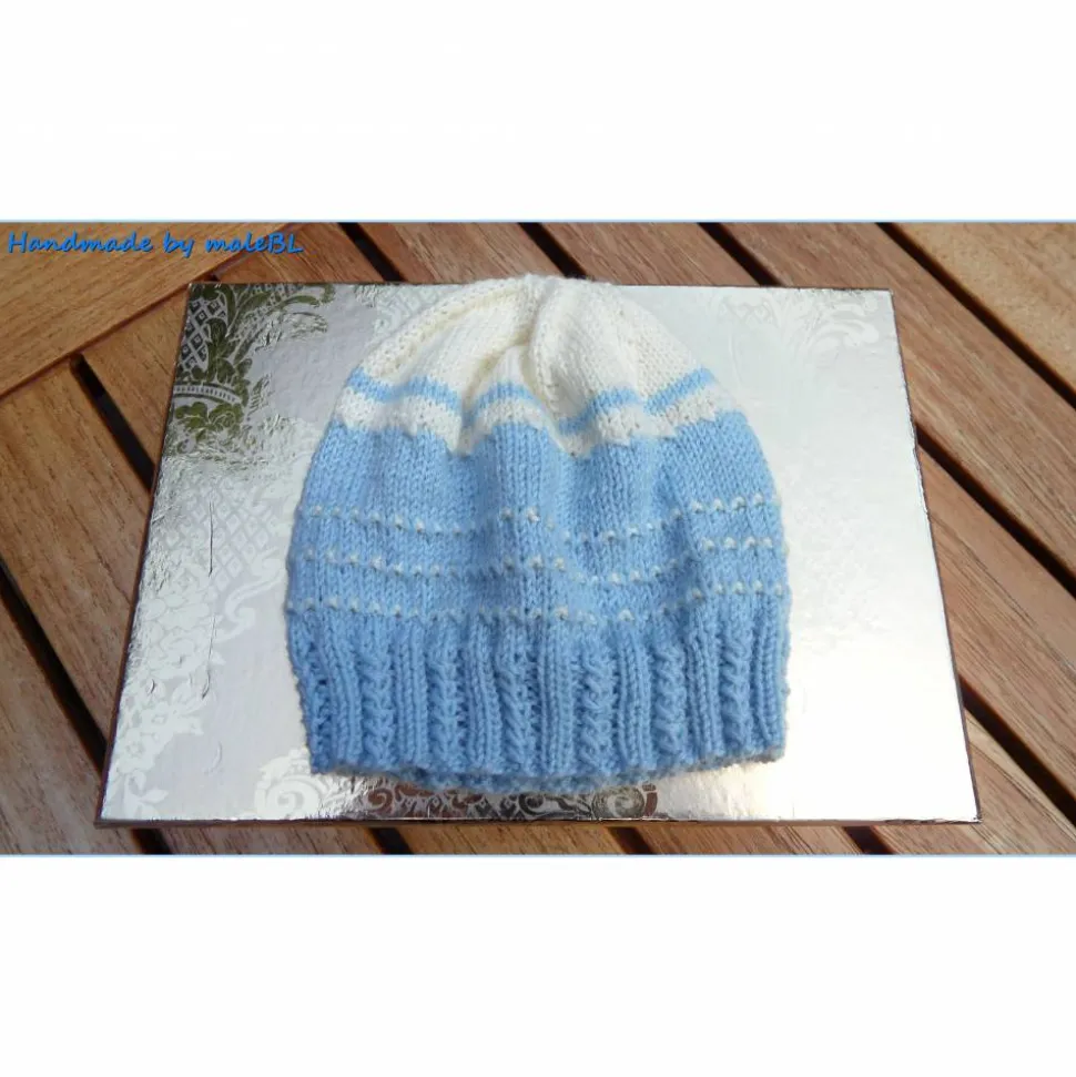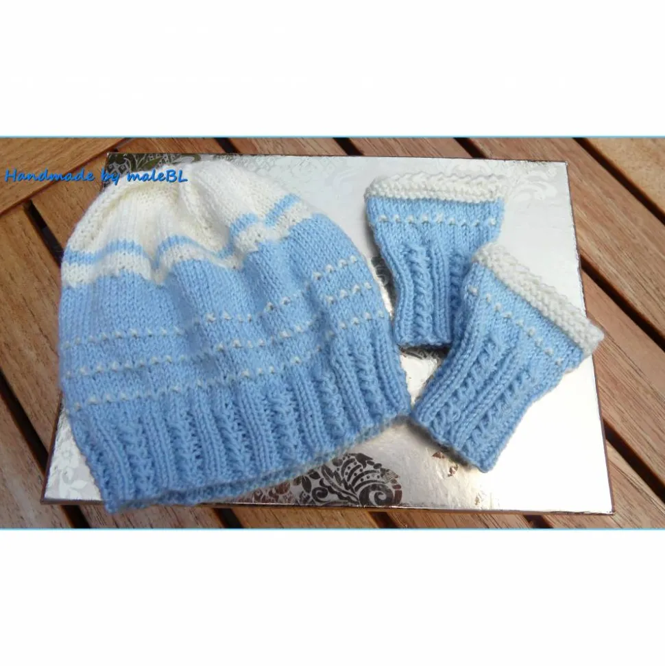 Die Mütze und die Pulswärmer wurden mit liebevollen, winzigen Zöpfen am unteren Rand gearbeitet und bestechen durch die edle Farbkombination aus hellblau und weiß.