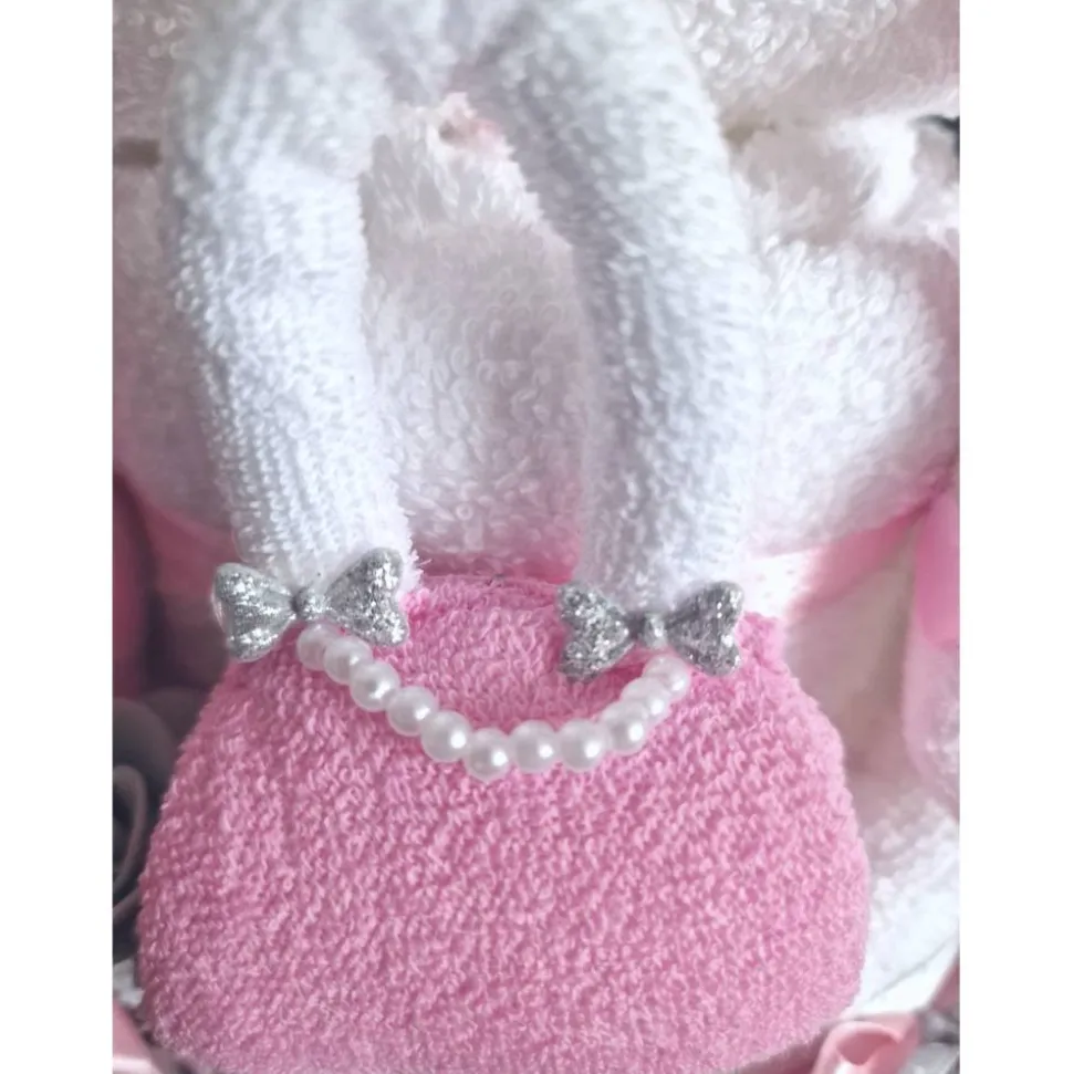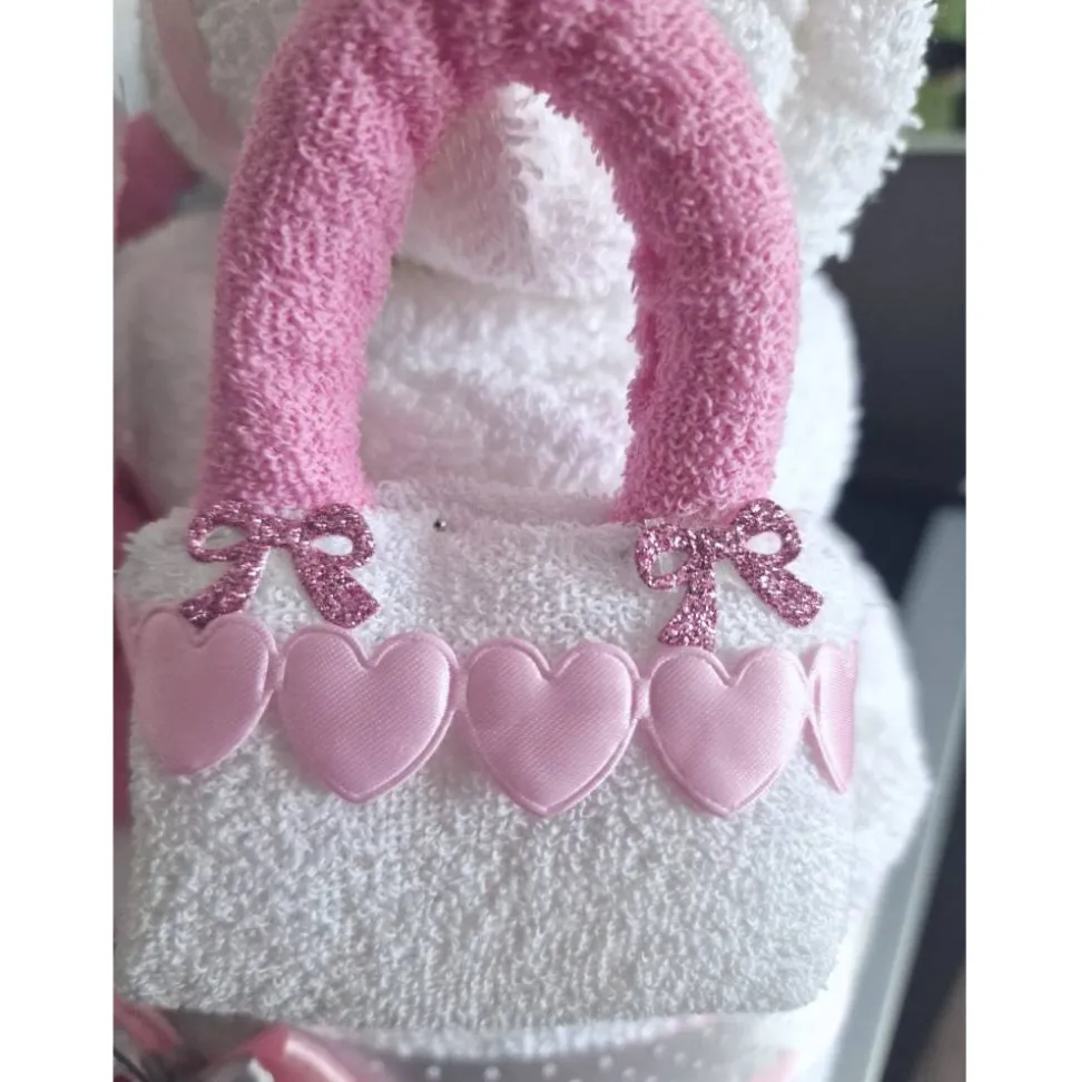 Die liebevoll gestaltete Handtuchtorte enthält 2 hochwertige, weiße Handtücher (50 x 100 cm, Baumwolle/Frottee) und sorgt für ein luxuriöses Wohlfühlerlebnis. Ergänzt wird das Set durch 3 Mini Handtaschen, gefertigt aus je 2 Frottee Kosmetiktüchern, die locker zusammengenäht sind und sich vielseitig verwenden lassen.