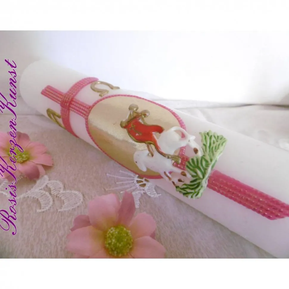 Material: Qualitätskerze ( RAL-Gütesiegel ), Wachsplatten, Verzierwachsstreifen, Wachsbuchstaben, Kerzenschutzlack