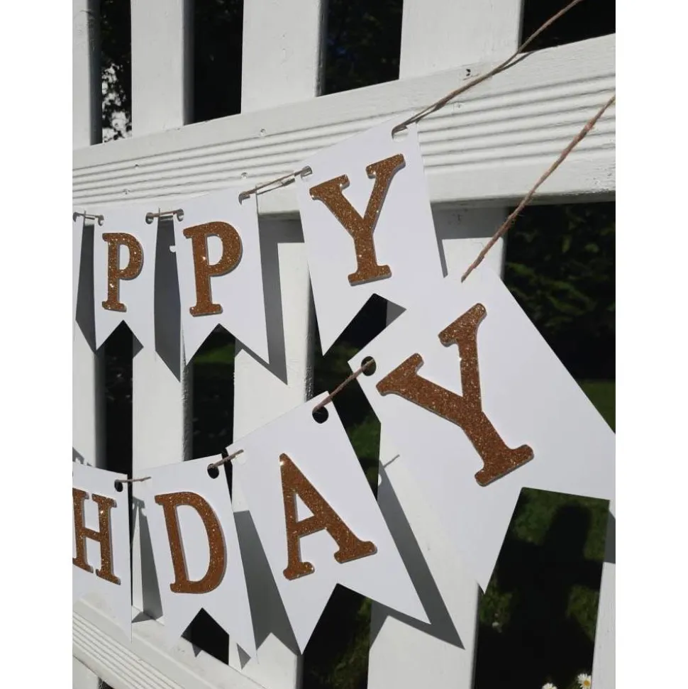 Ganz schlicht und elegant funkeln die goldenen Buchstaben auf den weißen Wimpeln.