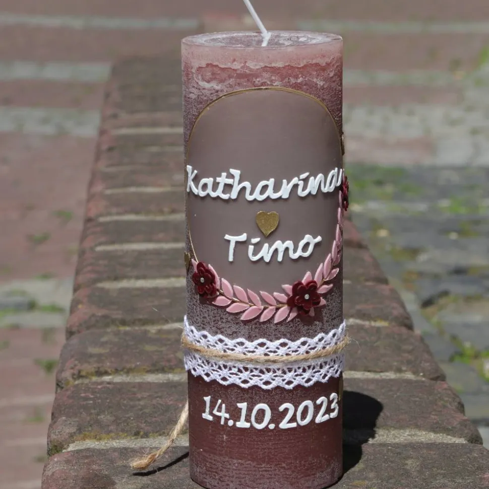 Die Verzierungen, gefertigt aus echtem Wachs und in mehreren Schichten in mühevoller Handarbeit angebracht, erzeugen einen beeindruckenden 3D-Effekt und erhöhen die Wertigkeit der Kerze. Diese Elemente zeugen von der Eleganz und Tiefe der Liebe, die Sie zueinander empfinden.