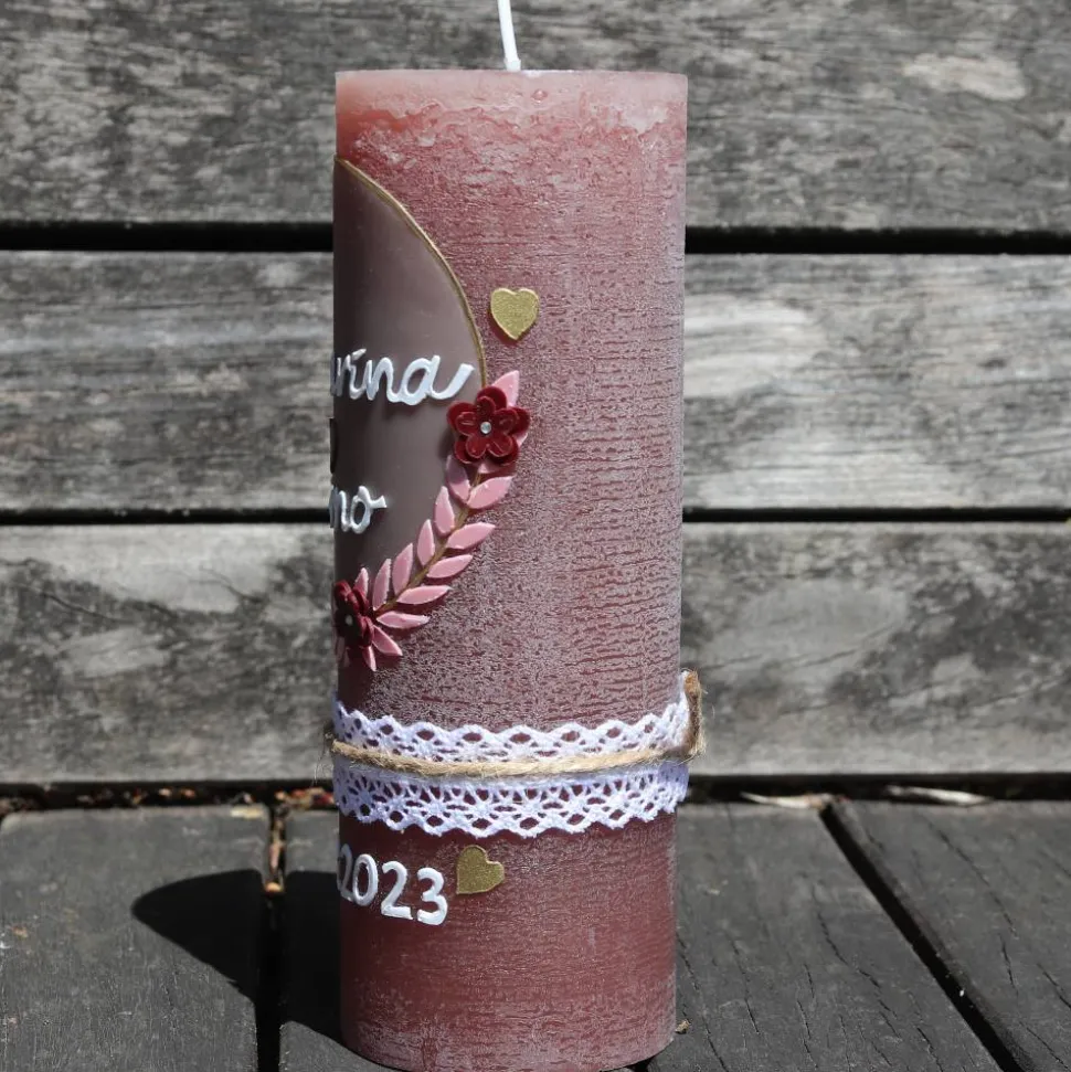 Lassen Sie sich von der unvergleichlichen Schönheit dieser Rustik-Hochzeitskerze verzaubern. Die tiefbraune Farbe, die an die Erde erinnert, symbolisiert die Wurzeln und die Stabilität Ihrer Liebe. Verziert mit 2 goldenen Herzen und einer kunstvoll gestalteten Blumenranke in dunklem Rosa und purpurroten Blüten, zeugt diese Kerze von der blühenden Liebe, die Sie zueinander haben.