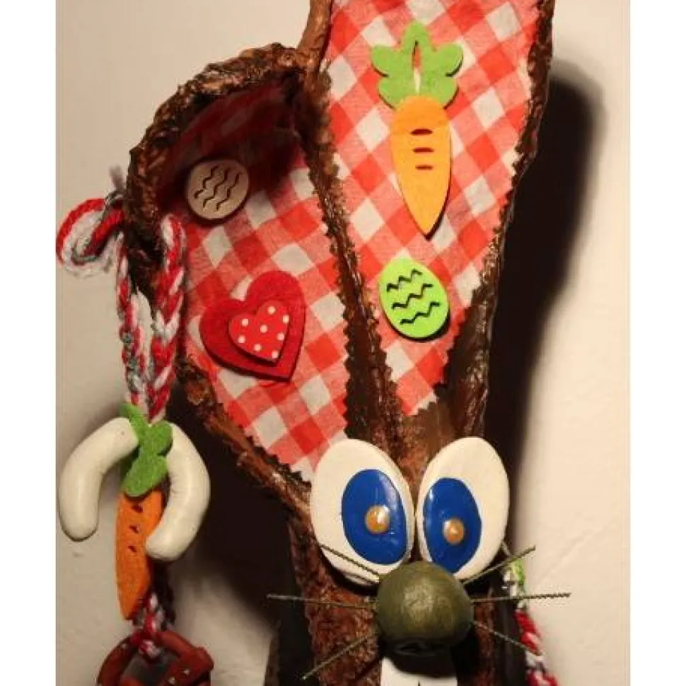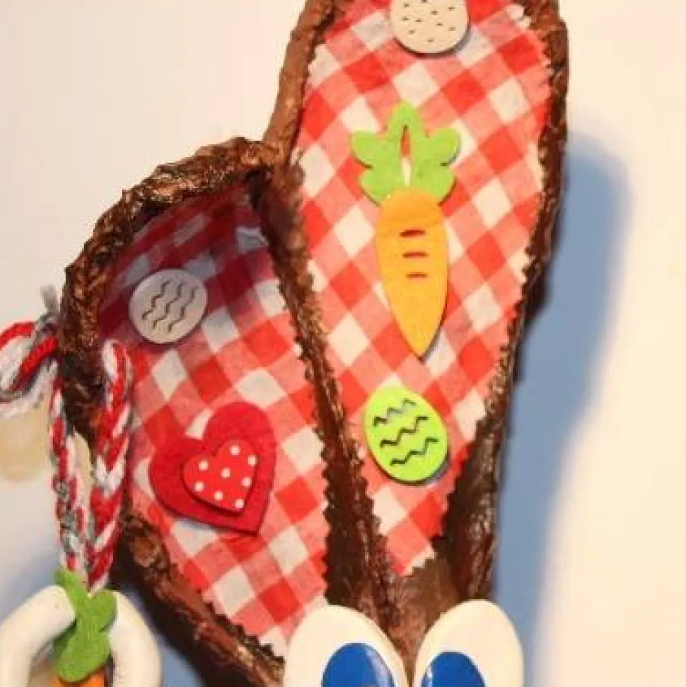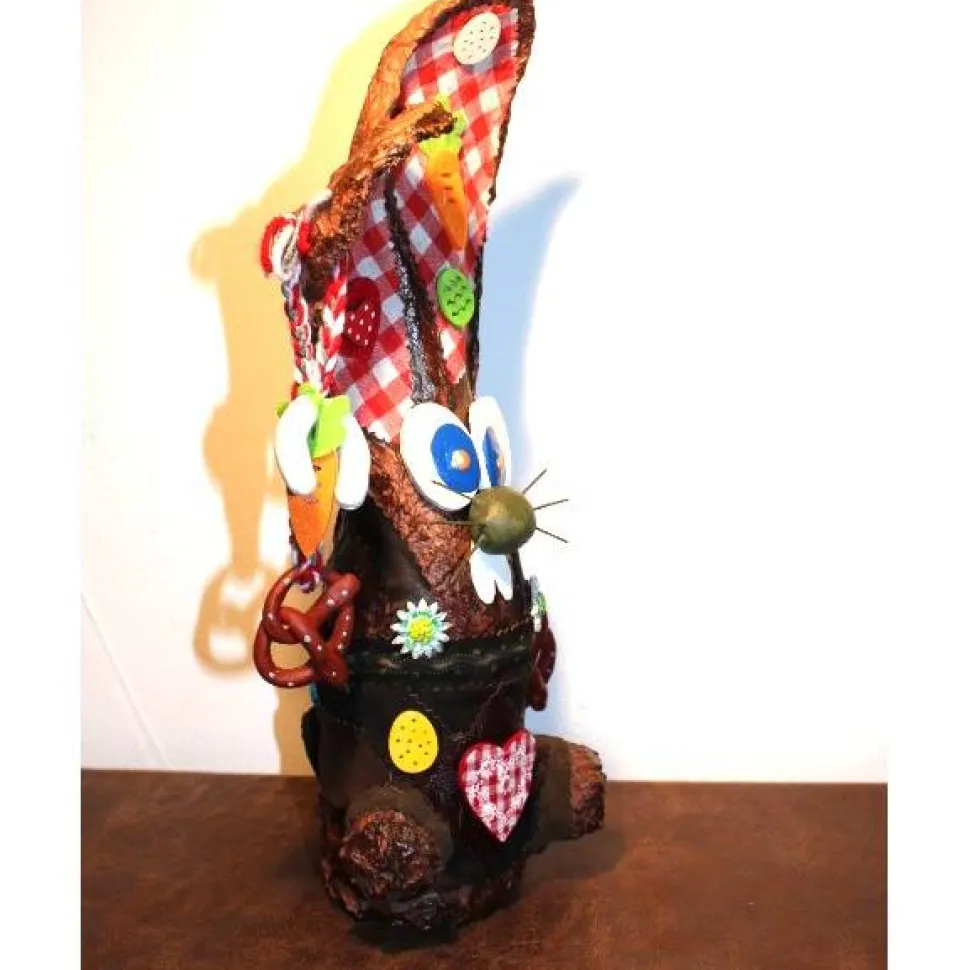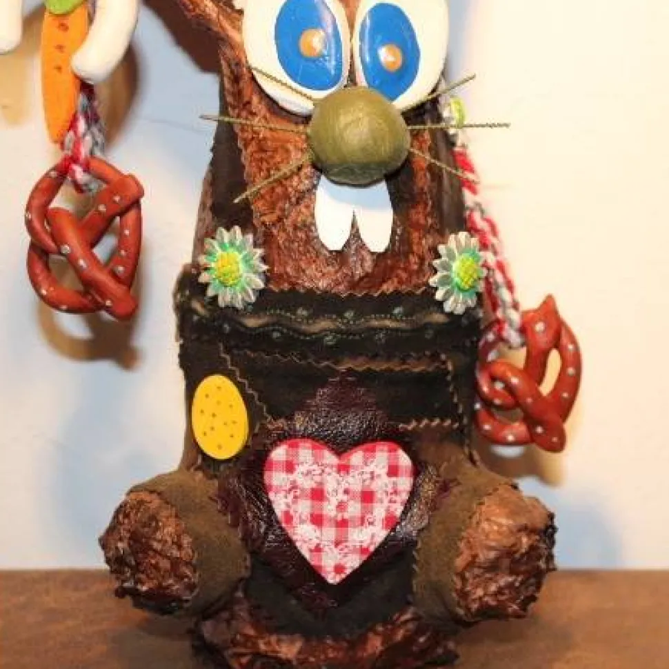 Das Haserl ist mit handgefertigten Weißwürsten, Brezn und Edelweiß aus Modelliermasse geschmückt. Nette Oster-Applikationen aus Filz und Holz runden das Bild des Bayernhaserls ab. Der Hase trägt eine „Lederhose“ aus Echt- und Kunstlederresten.
