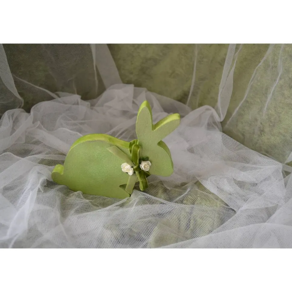 Dieser niedliche Holzhase wurde von Hand grün bemalt und ist mit einer dunkelgrünen Samtschleife sowie mit Papierblumen dekoriert.