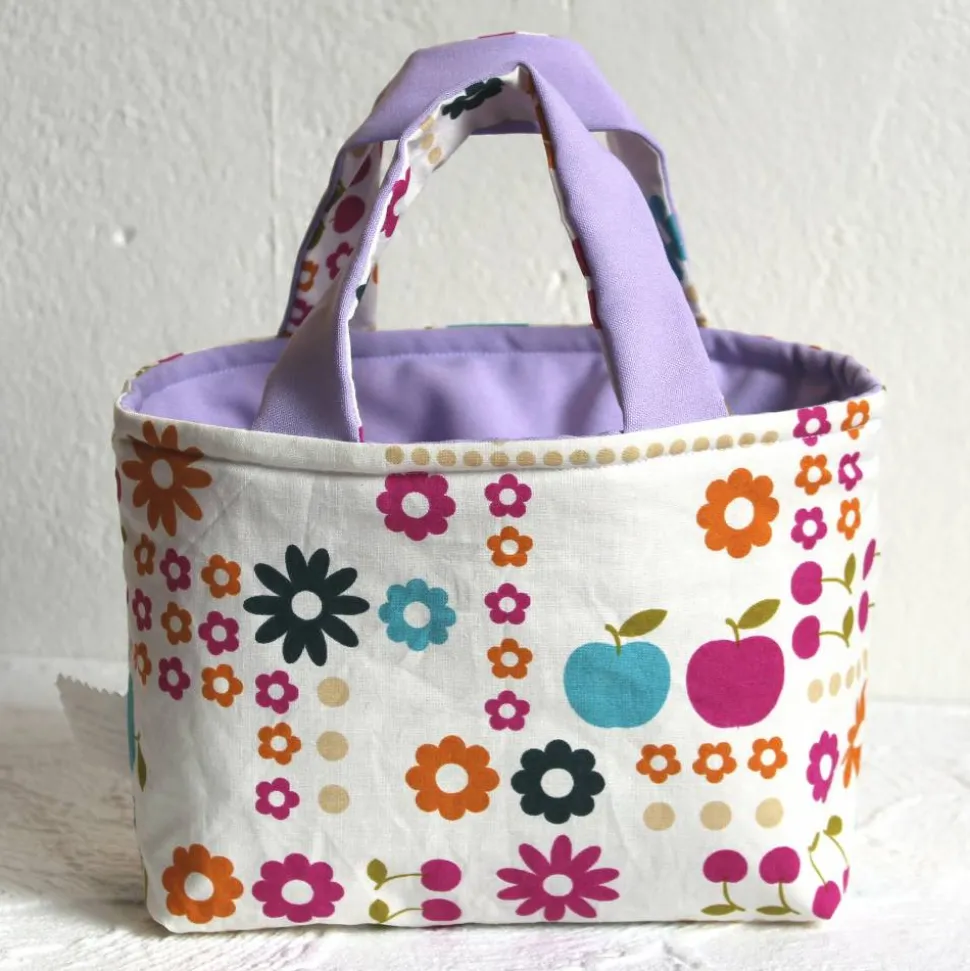 Die fliederfarbene Seite aus Baumwollstoff wurde mit einer Häschenapplikation aus Filz verziert. Wird das Täschchen umgestülpt kommt der Stoff mit den Blumen zur Geltung.