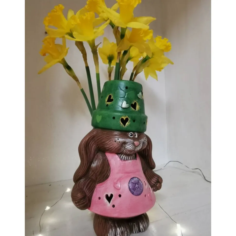 Das Hasenmädchen ist ca 20cm hoch, so ausgeschnitten, dass man sie prima beleuchten kann, ich empfehle LED Kerze oder Lichterkette zu verwenden Das Hasen Mädchen ist aus Keramik, handgemalt mit viel Liebe zum Detail, verwendet hab ich Acrylfarben und wetterfest versiegelt. Sie ist witterungsbeständig und kann draussen stehen, sollten aber vor Frost geschützt werden.