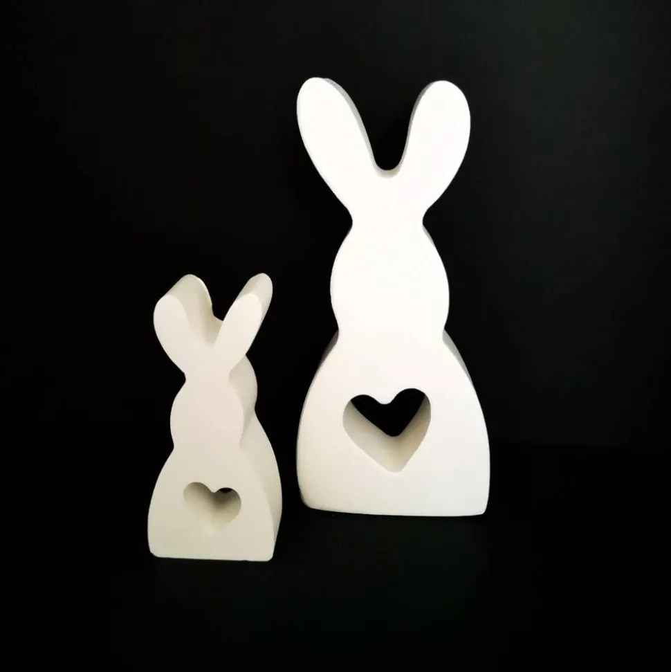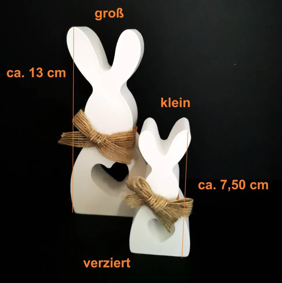 Ein großer Hase ist ca. 13 cm, ein kleiner Hase 7,50 cm hoch. Schlicht oder verspielt mit einem Juteschleifchen erhältlich.