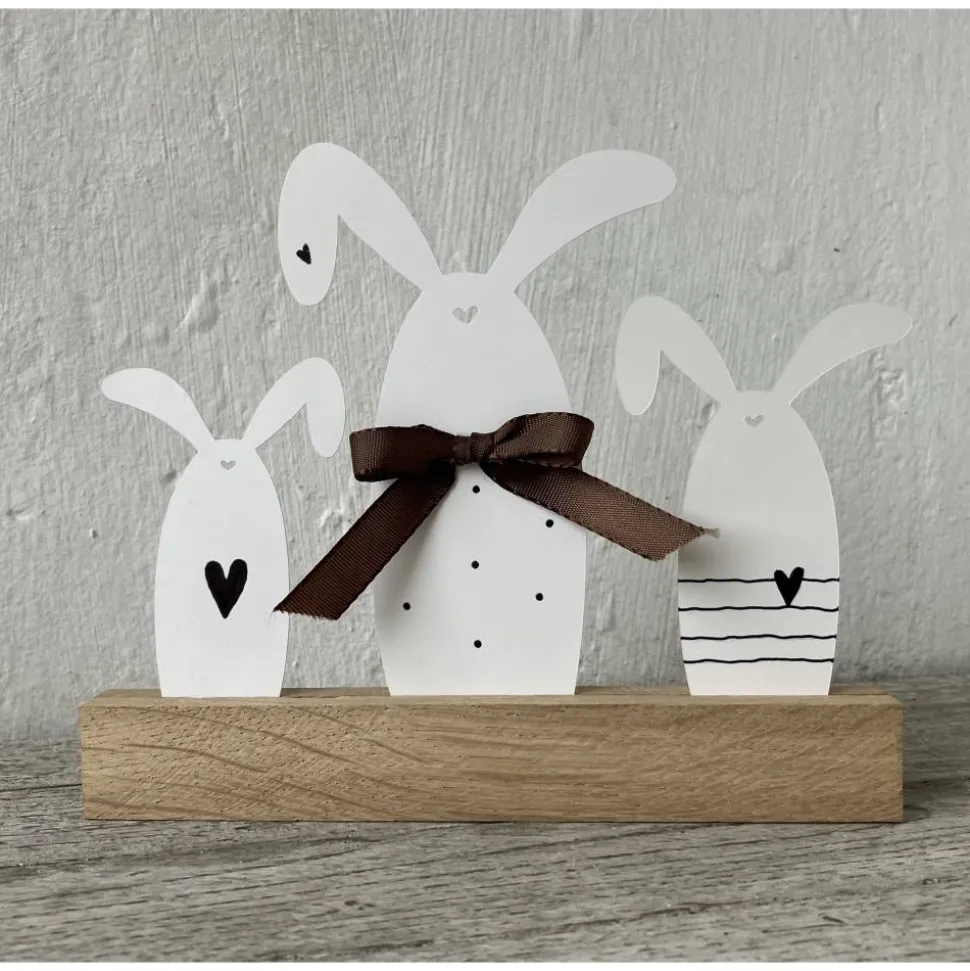 Das Hasen-Trio habe ich aus Fotokarton (300 g/m2) geplottet und händisch bemalt. Zwischen zwei Klötzchen aus unbehandeltem Eichenholz geklebt, finden sie ausreichend Stand. Das Objekt ist 16 cm breit und 12,5 cm hoch.