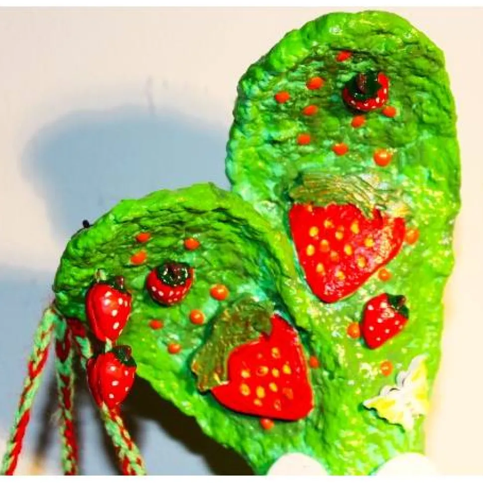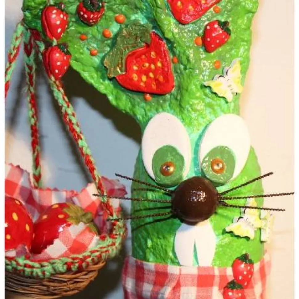 Witziges Upcycling-Projekt aus einer Glasflasche, gestaltet mit Altpapier, kleinen Polyresin-Schmetterlingen , Keramik- und Polyresin-Erdbeeren, Modelliermasse und Acrylfarbe. Das karierte Schürzerl ist aus Baumwollstoff. Die Keramikerdbeeren im Körbchen sind lose eingelegt und können beliebig platziert werden. Den Korb kann man auch als Behälter für einen Brief oder Geldschein verwenden. Er ist mit einem Wollbändchen im Ohr festgebunden.