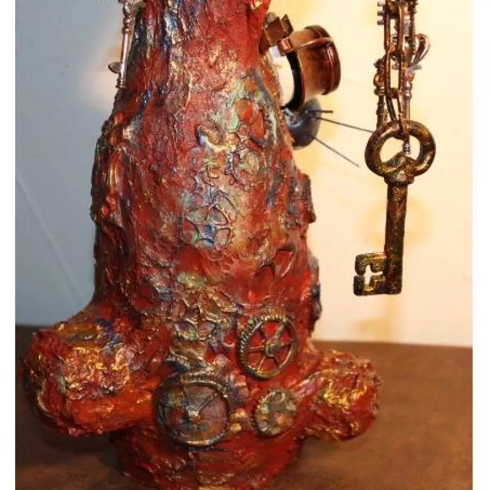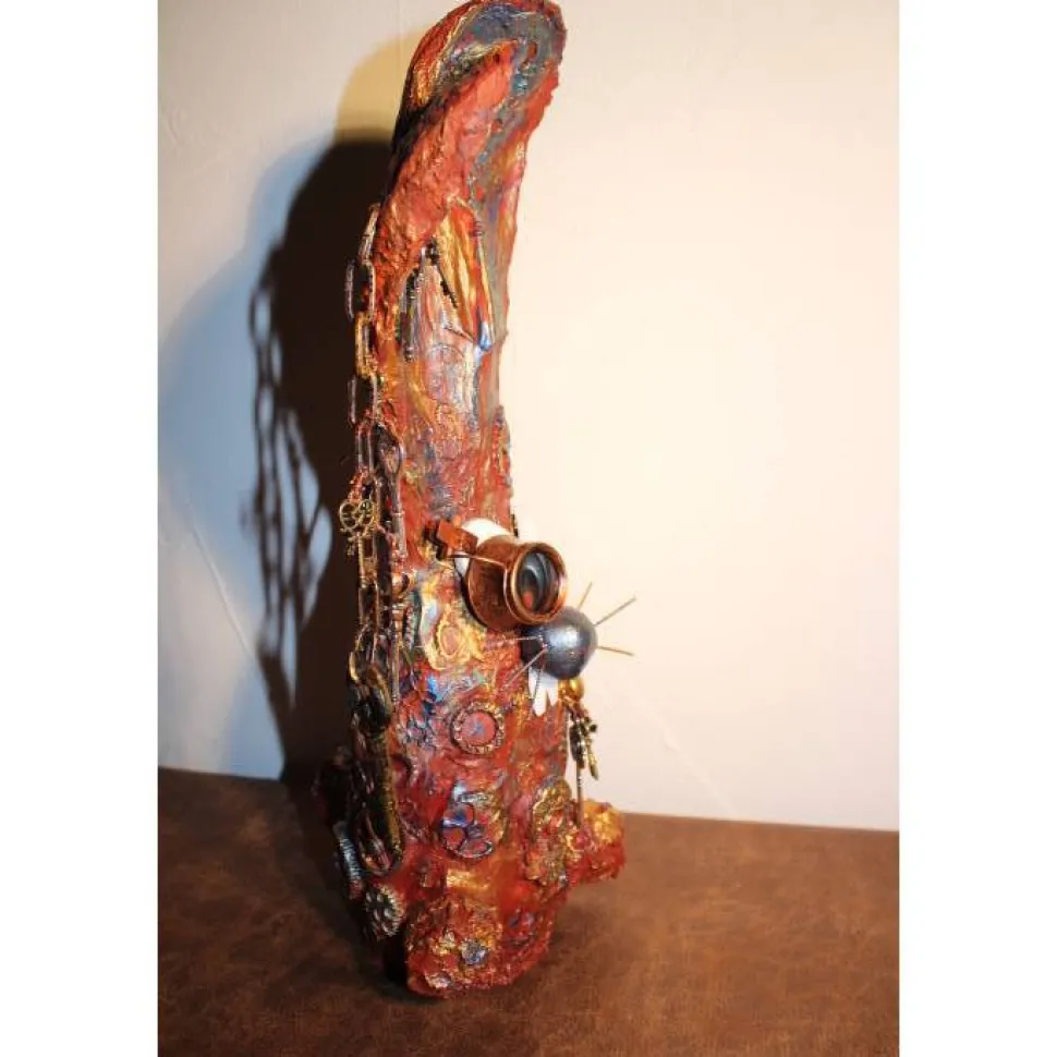 Das Haserl ist mit Zahnradabdrücken und Schlössern aus Modelliermasse dekoriert. Ideal für Steampunk-Fans ;). Eine Künstlerfigur der etwas anderen Art aus upgecycelten Materialien, wie Draht, Milchtütenpapier, Plastikdeckel, etc. !