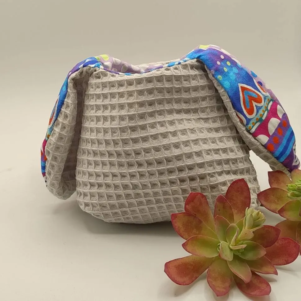 Der Hase ist ca. 12×12 cm groß, die Öffnung ist ca. 8cm breit, er besteht aus 100% Baumwolle und ist waschbar bei bis zu 60 Grad
