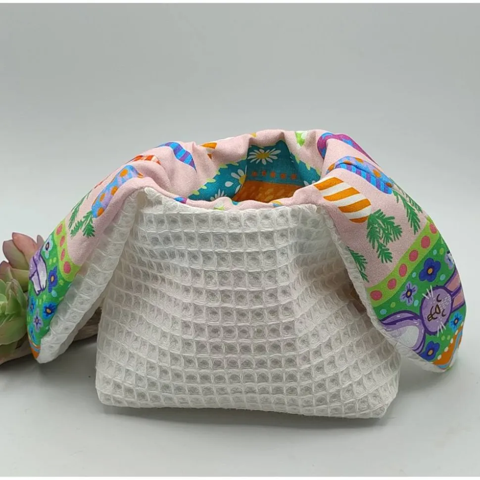 Der Hase ist ca. 12×12 cm groß, die Öffnung ist ca. 8cm breit, er besteht aus 100% Baumwolle und ist waschbar bei bis zu 60 Grad